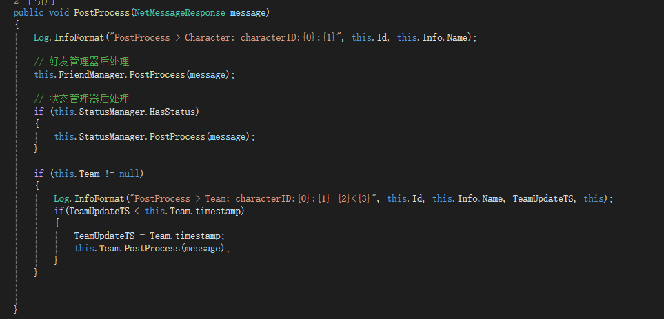 总的后处理入口中添加组队系统的后处理,如果角色目前的队伍信息的更新时间戳要小于Team的更新时间戳,就代表不是最新的信息,触发组队系统的后处理,因为这里是在Character里面添加的字段,所以每个队伍成员都会有该字段,这样就可以保证一个人加入队伍的时候,其他的队伍成员都会通过后处理更新一遍。