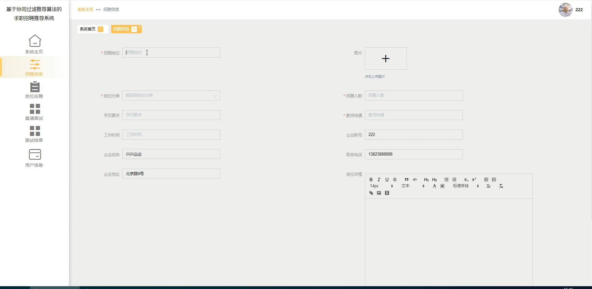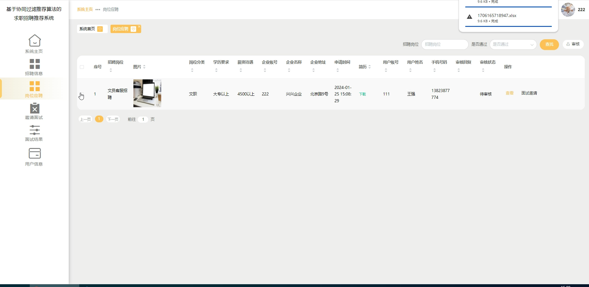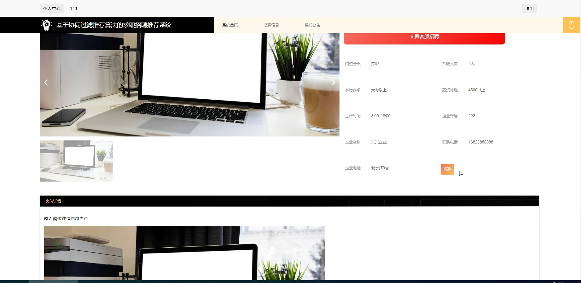 基于协同过滤推荐算法的求职招聘推荐系统u1ydn3f4(程序、源码、数据库、调试部署方案及开发环境)系统界面展示及获取方式置于文档末尾,可供参考。
