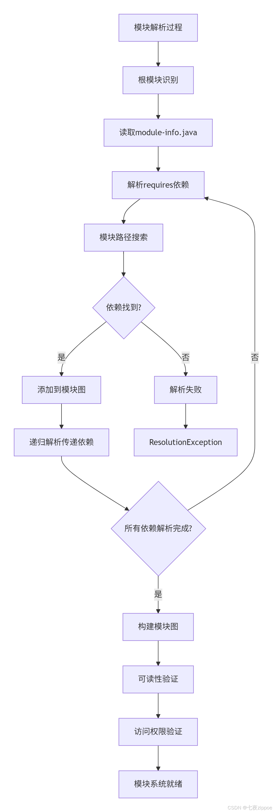 public class DynamicModuleManager {private final ModuleLayer.Controller layerController;private final Map<String, ModuleLayer> applicationLayers;public DynamicModuleManager() {this.applicationLayers = new HashMap<>();this.layerController = ModuleLayer.defineModulesWithOneLoader(Configuration.empty(), List.of(), ClassLoader.getSystemClassLoader()).controller();}// 动态加载业务模块public void loadBusinessModule(Path modulePath, String moduleName) {try {// 解析模块配置Configuration config = layerController.configuration().resolve(ModuleFinder.of(modulePath), ModuleFinder.of(), Set.of(moduleName));// 创建新模块层ModuleLayer newLayer = layerController.defineModules(config).layer();applicationLayers.put(moduleName, newLayer);// 初始化模块Optional<Module> module = newLayer.findModule(moduleName);module.ifPresent(this::initializeModule);} catch (ResolutionException e) {throw new ModuleLoadException("Failed to load module: " + moduleName, e);}}// 动态卸载模块public void unloadModule(String moduleName) {ModuleLayer layer = applicationLayers.remove(moduleName);if (layer != null) {// 清理模块资源cleanupModuleResources(layer);}}// 模块间服务调用public <T> Optional<T> getService(String moduleName, Class<T> serviceType) {return applicationLayers.get(moduleName).findModule(moduleName).flatMap(module -> ServiceLoader.load(module, serviceType).findFirst());}