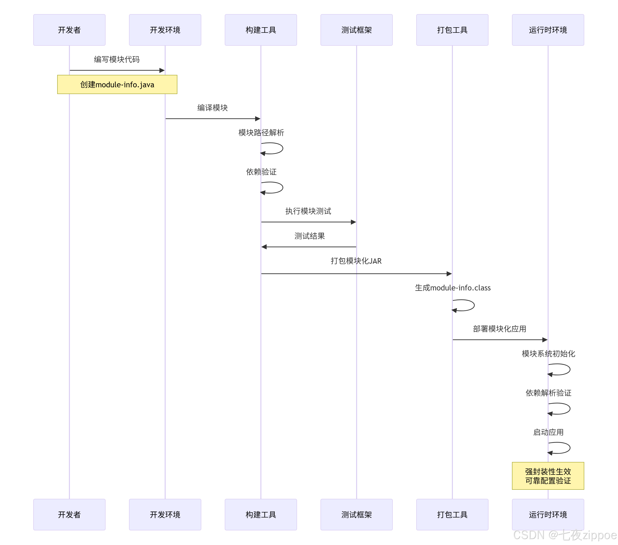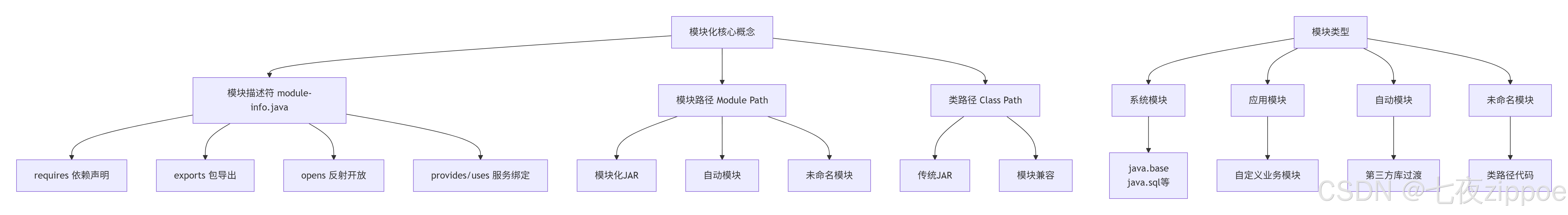 public class ModuleDescriptorSyntax {// 基本模块声明结构/*** module <module.name> {* requires [transitive] <module>;* exports <package>;* opens <package>;* provides <service> with <implementation>;* uses <service>;* }*/// 1. 依赖声明 requiresmodule com.example.library {requires java.logging; // 编译时+运行时依赖requires static java.sql; // 编译时依赖,运行时可选requires transitive commons.math; // 传递依赖}// 2. 包导出控制 exportsmodule com.example.api {exports com.example.api.public; // 导出到所有模块exports com.example.api.internal to com.example.impl; // 限定导出到特定模块}// 3. 反射开放 opensmodule com.example.persistence {opens com.example.persistence.entity; // 运行时反射开放opens com.example.persistence.internal to org.hibernate, spring.core; // 限定反射开放}// 4. 服务绑定 provides/usesmodule com.example.application {uses com.example.spi.EncoderService; // 声明服务消费者provides com.example.spi.EncoderService with com.example.encoder.Base64Encoder,com.example.encoder.MD5Encoder; // 提供服务实现}