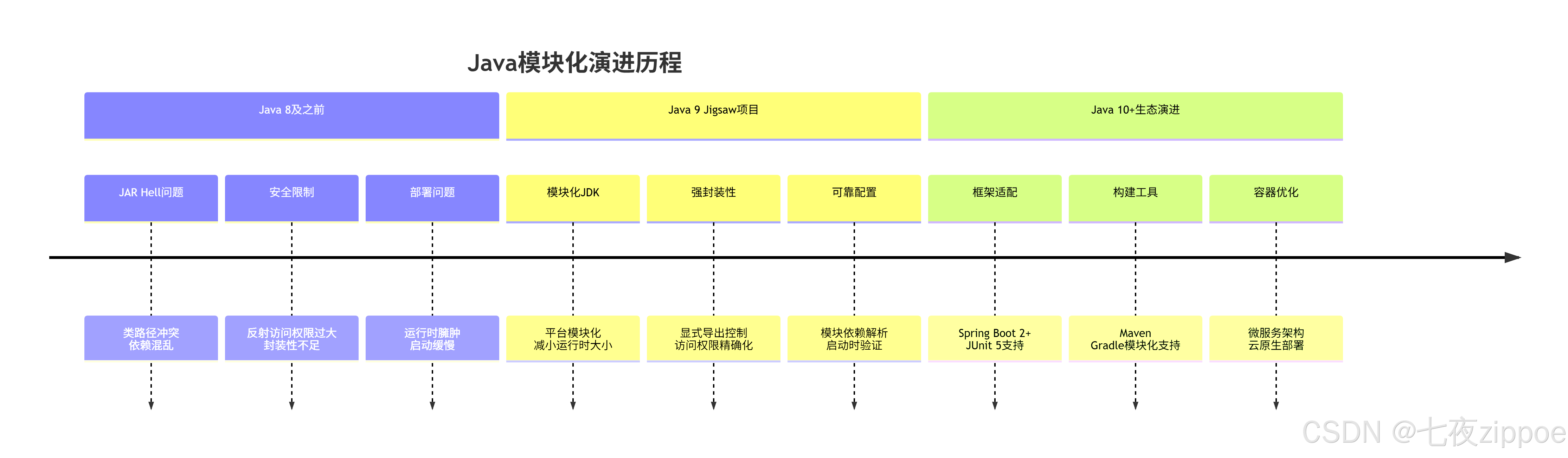public class TraditionalJarProblems {// 1. 类路径冲突问题public class ClasspathConflict {// 应用依赖不同版本的库// lib/commons-lang3-3.1.jar// lib/commons-lang3-3.9.jar ❌ 冲突!}// 2. 反射滥用问题public class ReflectionAbuse {public void accessPrivate() throws Exception {Class<?> clazz = Class.forName("com.internal.InternalClass");Field field = clazz.getDeclaredField("secret");field.setAccessible(true); // 传统方式可以任意访问Object value = field.get(null);}}// 3. 隐式依赖问题public class ImplicitDependencies {// 编译时不知道运行时需要哪些依赖// 缺少依赖直到运行时才报错}