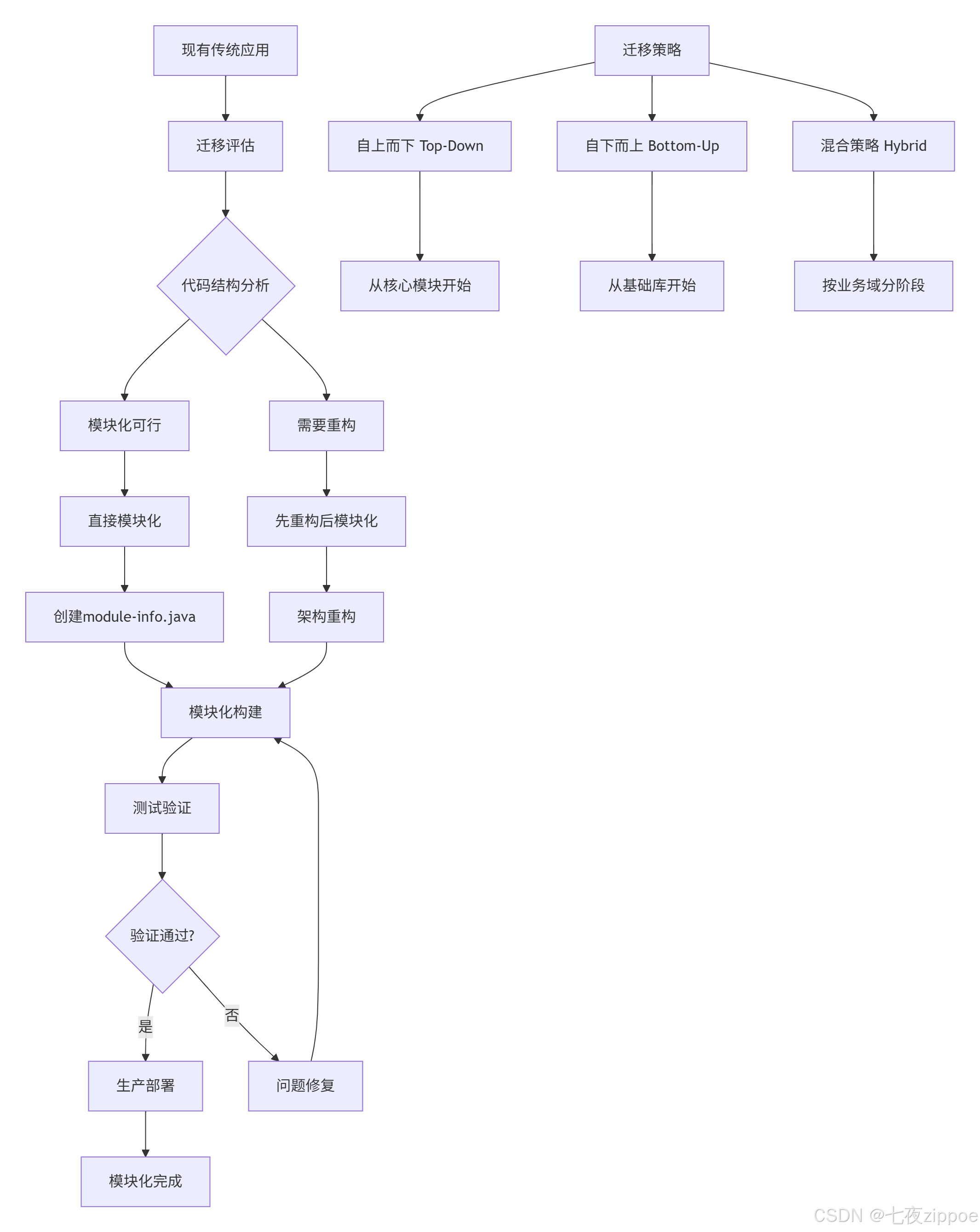 public class MigrationTroubleshooting {// 问题诊断表public enum CommonIssues {// 编译时问题MODULE_NOT_FOUND("模块找不到", "检查requires声明和模块路径"),PACKAGE_NOT_EXPORTED("包未导出", "添加exports声明或opens声明"),// 运行时问题CLASS_NOT_FOUND("类找不到", "检查模块依赖和导出设置"),ILLEGAL_ACCESS("非法访问", "使用opens开放反射访问权限"),// 构建问题CIRCULAR_DEPENDENCY("循环依赖", "重构模块结构,引入服务抽象"),BUILD_FAILURE("构建失败", "检查编译器版本和模块配置")}// 解决方案示例public class ReflectionMigration {// 迁移前:滥用反射public void illegalReflectionAccess() throws Exception {Class<?> clazz = Class.forName("com.internal.Config");Field field = clazz.getDeclaredField("secretKey");field.setAccessible(true); // ❌ 模块化后失败String key = (String) field.get(null);}// 迁移后:合法访问方式public void modularReflectionAccess() {// 方案1:使用opens声明// module-info.java: opens com.internal to current.module;// 方案2:使用标准APIOptional<String> key = Config.getSecretKey();// 方案3:服务接口方式ConfigService service = ServiceLoader.load(ConfigService.class).findFirst().orElseThrow();String key = service.getSecretKey();}}// 自动模块迁移策略public class AutomaticModuleMigration {// 非模块化JAR作为自动模块使用// 在module-info.java中:requires legacy.lib; // 自动模块名称来自JAR文件名// 自动模块特性:// - 导出所有包// - 依赖所有模块// - 开放所有包用于反射// - 临时迁移方案,最终需要真正模块化}