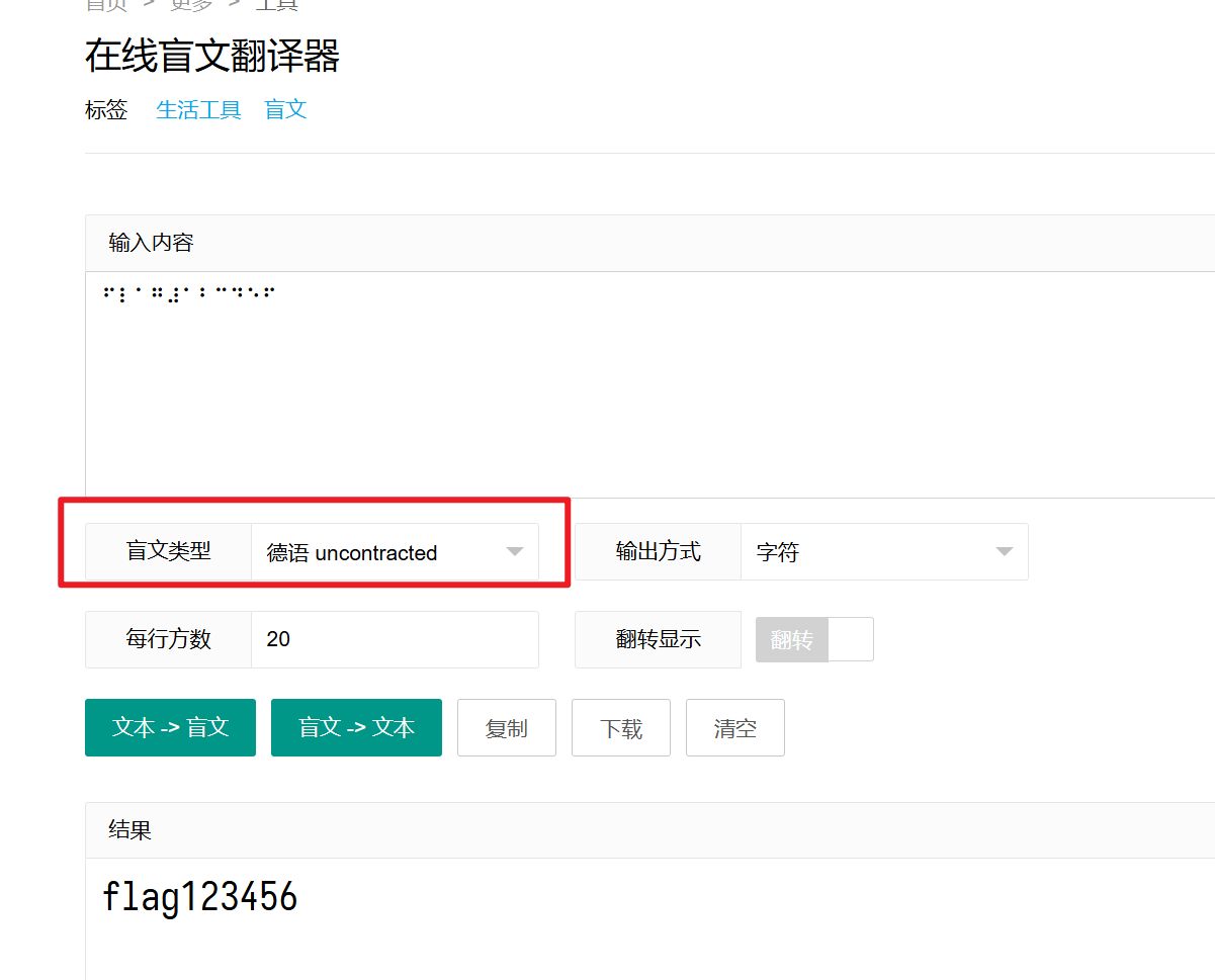 选择德语 uncontracted 盲文类型,出现了不乱码且不一样的结果