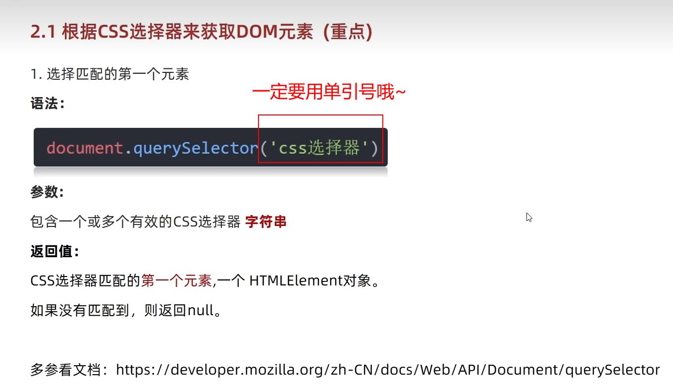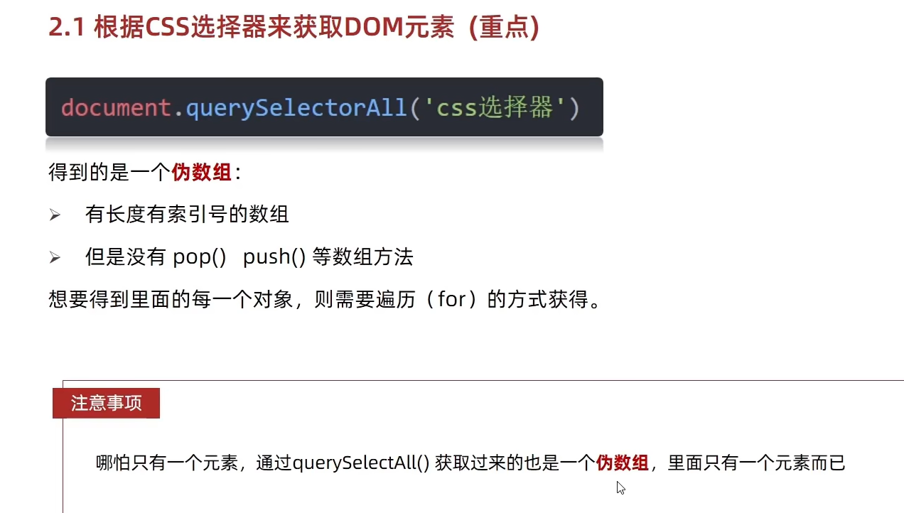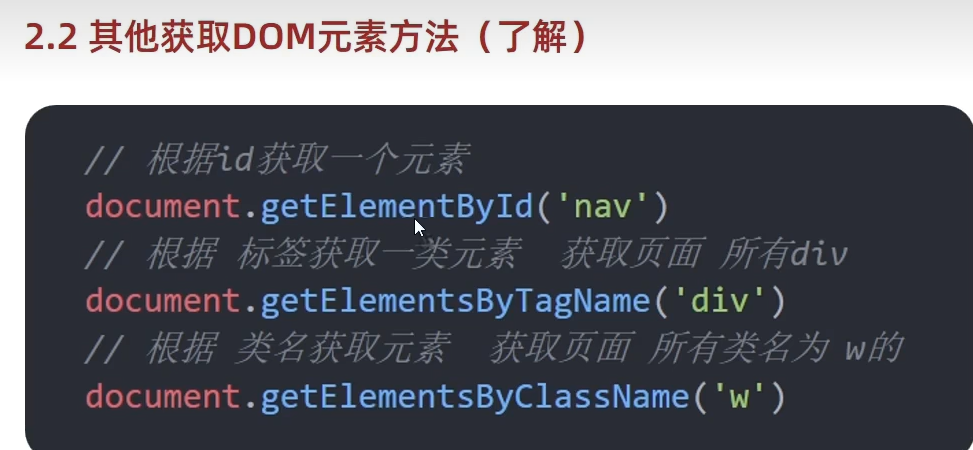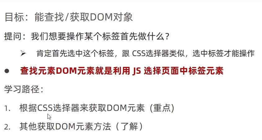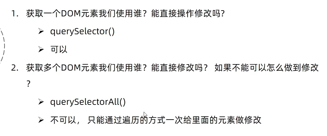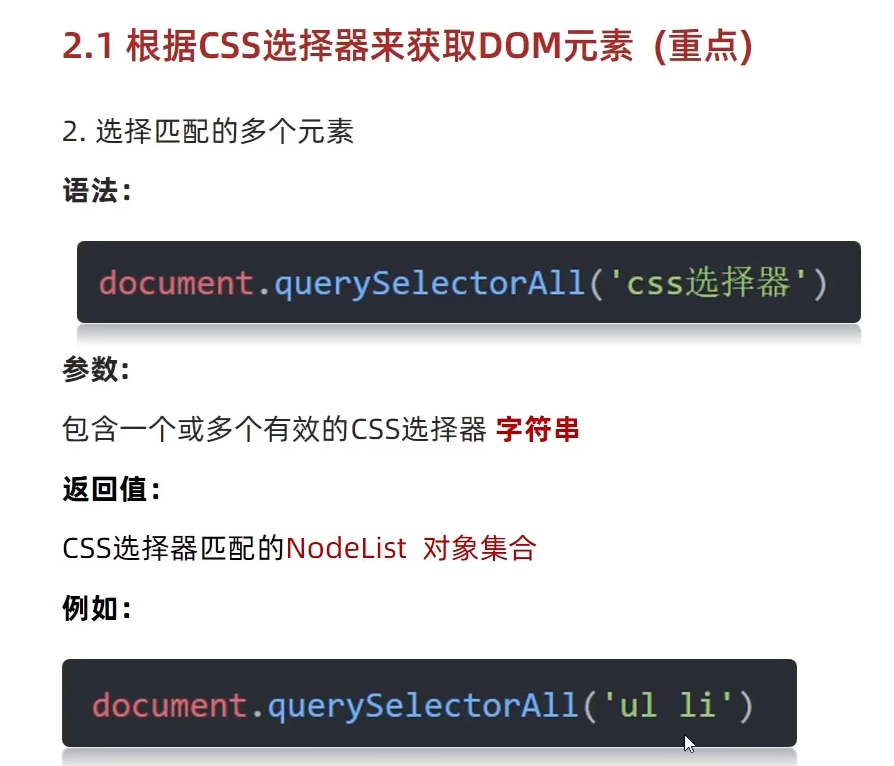<div>123</div><p id="nav">导航栏</p><ul><li>首页</li><li>关于我们</li><li>联系我们</li></ul><script>//获取第一个元素const box = document.querySelector('div');console.dir(box);//这个是利用id选择器const nav = document.querySelector('#nav');console.log(nav);//获取第一个ul 里面的li的第一个孩子const li = document.querySelector('ul li:first-child');console.log(li);</script>