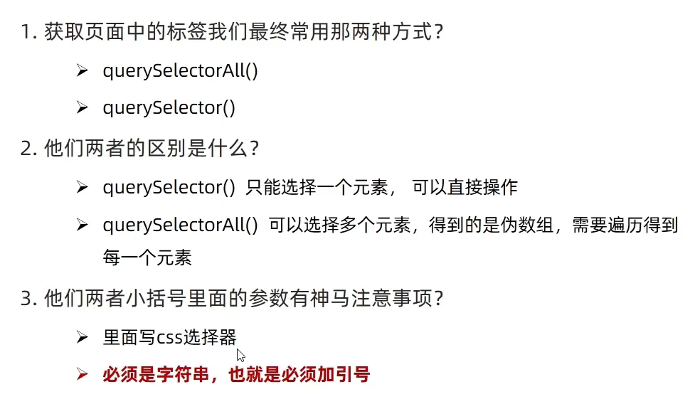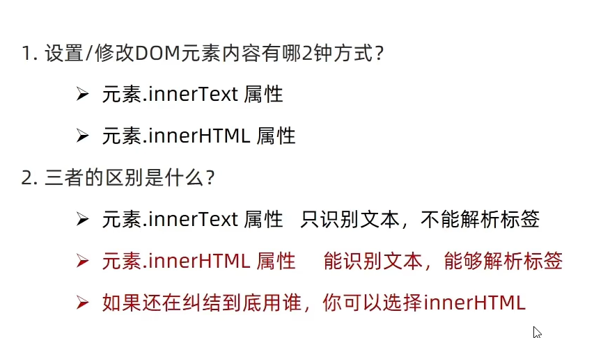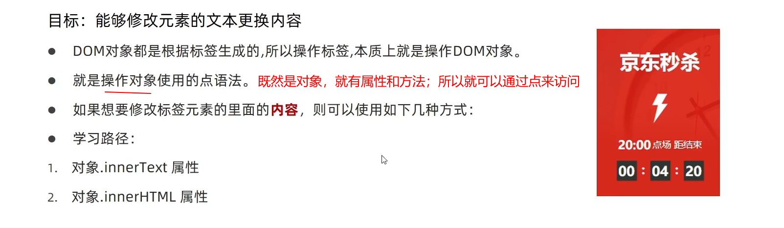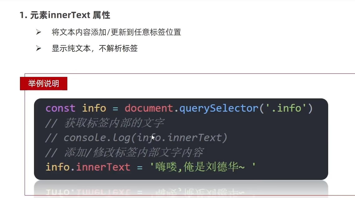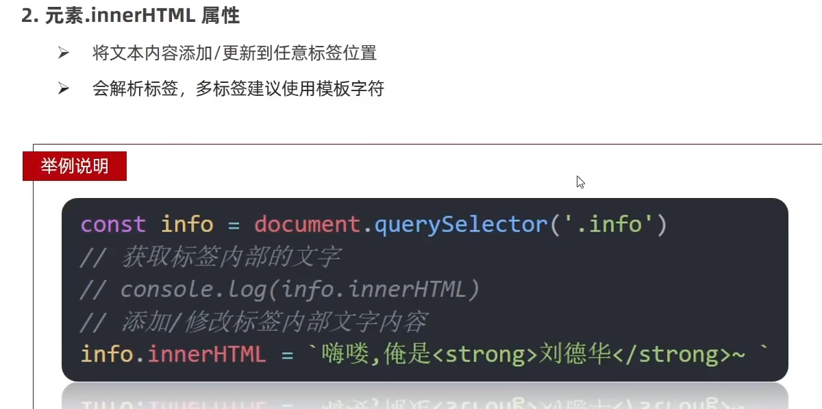 <div class="box">我是文字的内容</div><script>//第一步先获取元素const box = document.querySelector('.box');//第二步修改元素的内容console.log(box.innerText);// 实际上加粗标签是不会生效的,识别不了box.innerText = '<strong>我是新内容</strong>';![]()