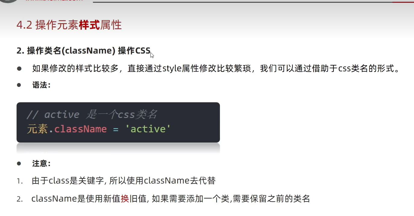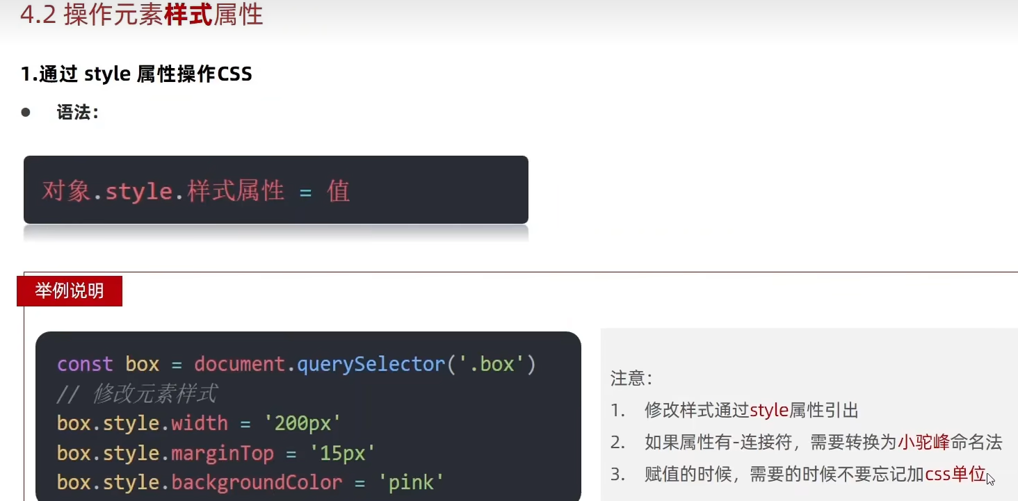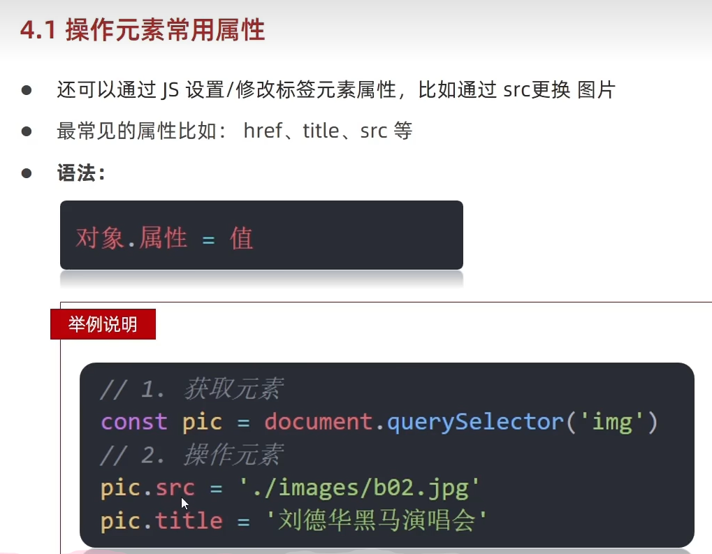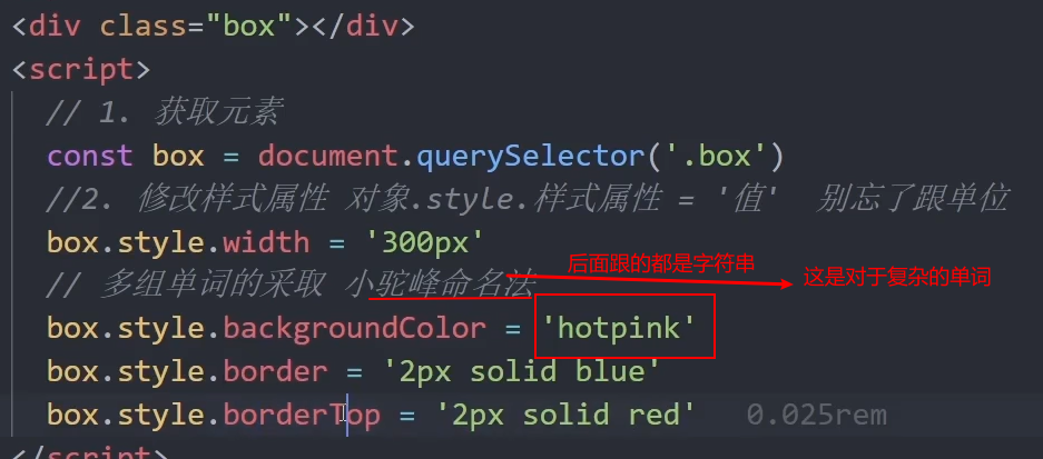 <div class="box">我是文字的内容</div><script>//第一步先获取元素const box = document.querySelector('.box');//第二步修改元素的内容console.log(box.innerText);// 实际上加粗标签是不会生效的,识别不了box.innerText = '<strong>我是新内容</strong>';![]()