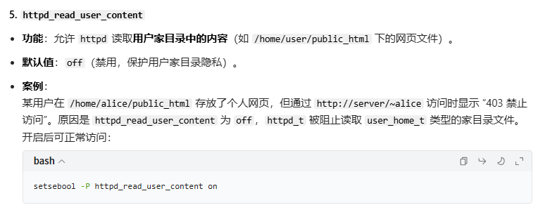 allow httpd_t httpd_sys_content_t:file read;(允许 httpd 进程读取 Web 目录的文件)。若将