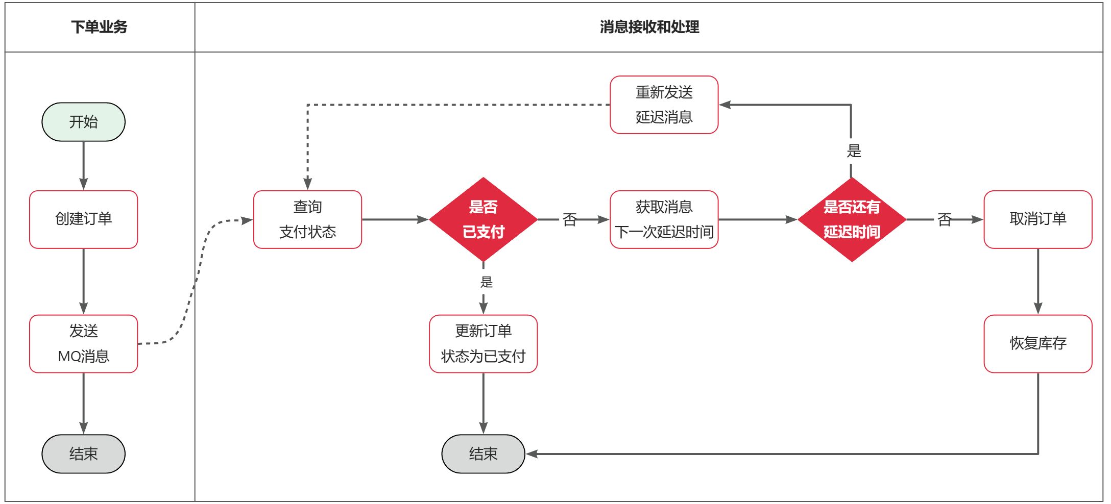 public class OrderService {@Autowiredprivate RabbitTemplate rabbitTemplate;@Autowiredprivate OrderMapper orderMapper;@Autowiredprivate InventoryService inventoryService;/*** 创建订单并发送延迟消息*/@Transactionalpublic RespResult createOrder(OrderCreateDTO orderCreateDTO) {// 1. 创建订单实体OrderInfo order = new OrderInfo();order.setOrderNo(generateOrderNo());order.setStatus(OrderStatus.WAITING_FOR_PAYMENT);order.setCreateTime(new Date());order.setAmount(orderCreateDTO.getAmount());// 设置其他订单属性...// 2. 保存订单到数据库orderMapper.insert(order);// 3. 扣减库存try {inventoryService.decreaseStock(orderCreateDTO.getSkuId(), orderCreateDTO.getQuantity());} catch (Exception e) {log.error("扣减库存失败,订单号:{}", order.getOrderNo(), e);throw new RuntimeException("库存不足,订单创建失败");}// 4. 发送延迟消息到RabbitMQ(30分钟超时)rabbitTemplate.convertAndSend(OrderRabbitMQConfig.ORDER_EXCHANGE,OrderRabbitMQConfig.ORDER_ROUTING_KEY,order.getOrderNo(),message -> {message.getMessageProperties().setExpiration("1800000");return message;});log.info("订单创建成功,订单号:{},已发送30分钟延迟消息", order.getOrderNo());return RespResult.success(order);}/*** 监听死信队列,处理超时订单*/@RabbitListener(queues = OrderRabbitMQConfig.ORDER_DLX_QUEUE)@Transactionalpublic void handleTimeoutOrder(String orderNo) {log.info("开始处理超时订单:{}", orderNo);try {// 查询订单信息OrderInfo order = orderMapper.selectByOrderNo(orderNo);if (order == null) {log.warn("订单不存在:{}", orderNo);return;}// 检查订单状态,只有待支付订单才需要取消[4,5](@ref)if (order.getStatus() == OrderStatus.WAITING_FOR_PAYMENT) {cancelOrder(order);log.info("订单超时取消成功:{}", orderNo);} else {log.info("订单已处理,状态为:{},无需取消:{}", order.getStatus(), orderNo);}} catch (Exception e) {log.error("处理超时订单异常:{}", orderNo, e);// 抛出异常让RabbitMQ重试throw new RuntimeException("处理超时订单失败", e);}}/*** 取消订单业务逻辑*/private void cancelOrder(OrderInfo order) {// 1. 更新订单状态为已取消order.setStatus(OrderStatus.CANCELLED);order.setCancelTime(new Date());order.setCancelReason("超时未支付");orderMapper.updateById(order);// 2. 恢复库存[1](@ref)inventoryService.increaseStock(order.getSkuId(), order.getQuantity());log.info("订单取消完成,订单号:{},已恢复库存", order.getOrderNo());}/*** 支付成功回调*/@Transactionalpublic RespResult paySuccess(String orderNo) {OrderInfo order = orderMapper.selectByOrderNo(orderNo);if (order == null) {return RespResult.error("订单不存在");}if (order.getStatus() != OrderStatus.WAITING_FOR_PAYMENT) {return RespResult.error("订单状态异常");}// 更新订单状态为已支付order.setStatus(OrderStatus.PAID);order.setPayTime(new Date());orderMapper.updateById(order);log.info("订单支付成功:{}", orderNo);return RespResult.success("支付成功");}/*** 生成订单号*/private String generateOrderNo() {SimpleDateFormat sdf = new SimpleDateFormat("yyyyMMddHHmmss");String timeStr = sdf.format(new Date());String randomStr = String.valueOf((int)((Math.random() * 9 + 1) * 1000));return timeStr + randomStr;}