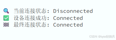 }fn main() {// Arc实现线程间共享,Mutex保证可变安全let conn_state = Arc::new(Mutex::new(BtConnState::Disconnected));let conn_state_clone = Arc::clone(&conn_state);// 模拟设备连接线程let handle = thread::spawn(move || {thread::sleep(Duration::from_millis(100)); // 缩短休眠时间{let mut state = conn_state_clone.lock().unwrap();*state = BtConnState::Connected;} // 锁提前释放,避免在锁内进行I/O// 强制刷新输出缓冲区println!("✅ 设备连接成功: Connected");io::stdout().flush().unwrap(); // 关键修复:确保输出立即刷新});// 主线程查询状态thread::sleep(Duration::from_millis(50));{let state = conn_state.lock().unwrap();println!("🔍 当前连接状态: {:?}", *state);io::stdout().flush().unwrap(); // 强制刷新}handle.join().unwrap();// 最终状态检查{let state = conn_state.lock().unwrap();println!("🏁 最终连接状态: {:?}", *state);io::stdout().flush().unwrap(); // 强制刷新}