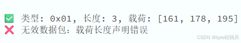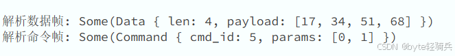 }fn main() {let data_frame = [0x01, 0x04, 0x11, 0x22, 0x33, 0x44];println!("解析数据帧: {:?}", parse_frame(&data_frame));let cmd_frame = [0x02, 0x05, 0x00, 0x01];println!("解析命令帧: {:?}", parse_frame(&cmd_frame));