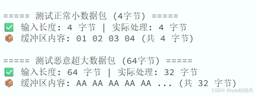 }fn main() {println!("===== 测试正常小数据包 (4字节) =====");let input_data = [0x01, 0x02, 0x03, 0x04];parse_bt_frame(&input_data);println!("\n===== 测试恶意超大数据包 (64字节) =====");let large_input = [0xAA; 64]; // 故意构造超大数据包parse_bt_frame(&large_input);