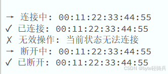 }fn main() {let mut device = BluetoothDevice::new("00:11:22:33:44:55");device.connect(); // 正常连接device.connect(); // 无效操作(已连接)device.disconnect(); // 正常断开