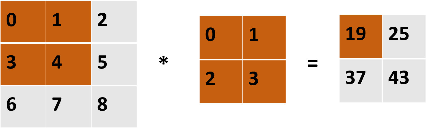 在二维互相关运算中,卷积窗口从输入数组的最左上方开始,按从左往右、从上往下的顺序,依次在输入数组上滑动。当卷积窗口滑动到某一位置时,窗口中的输入子数组与核数组按元素相乘并求和,得到输出数组中相应位置的元素。上图中的输出数组高和宽分别为2,其中的4个元素由二维互相关运算得出:0×0+1×1+3×2+4×3=19, 1×0+2×1+4×2+5×3=25, 3×0+4×1+6×2+7×3=37,4×0+5×1+7×2+8×3=43.