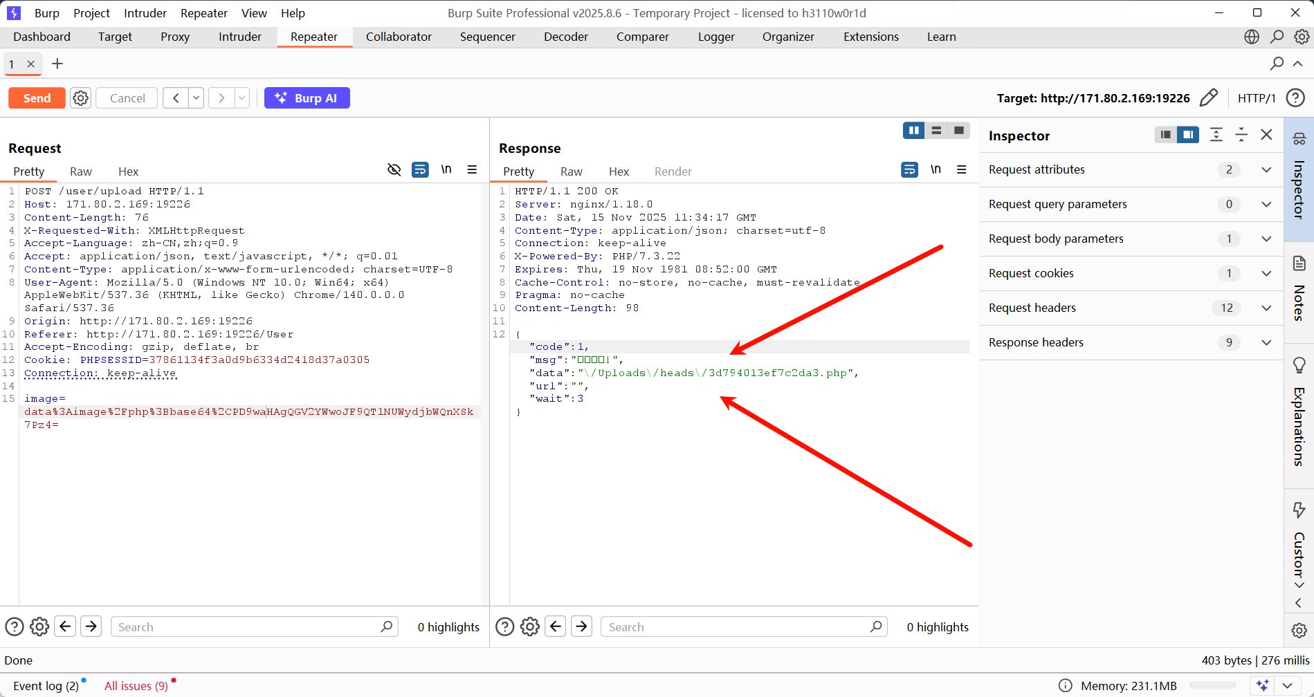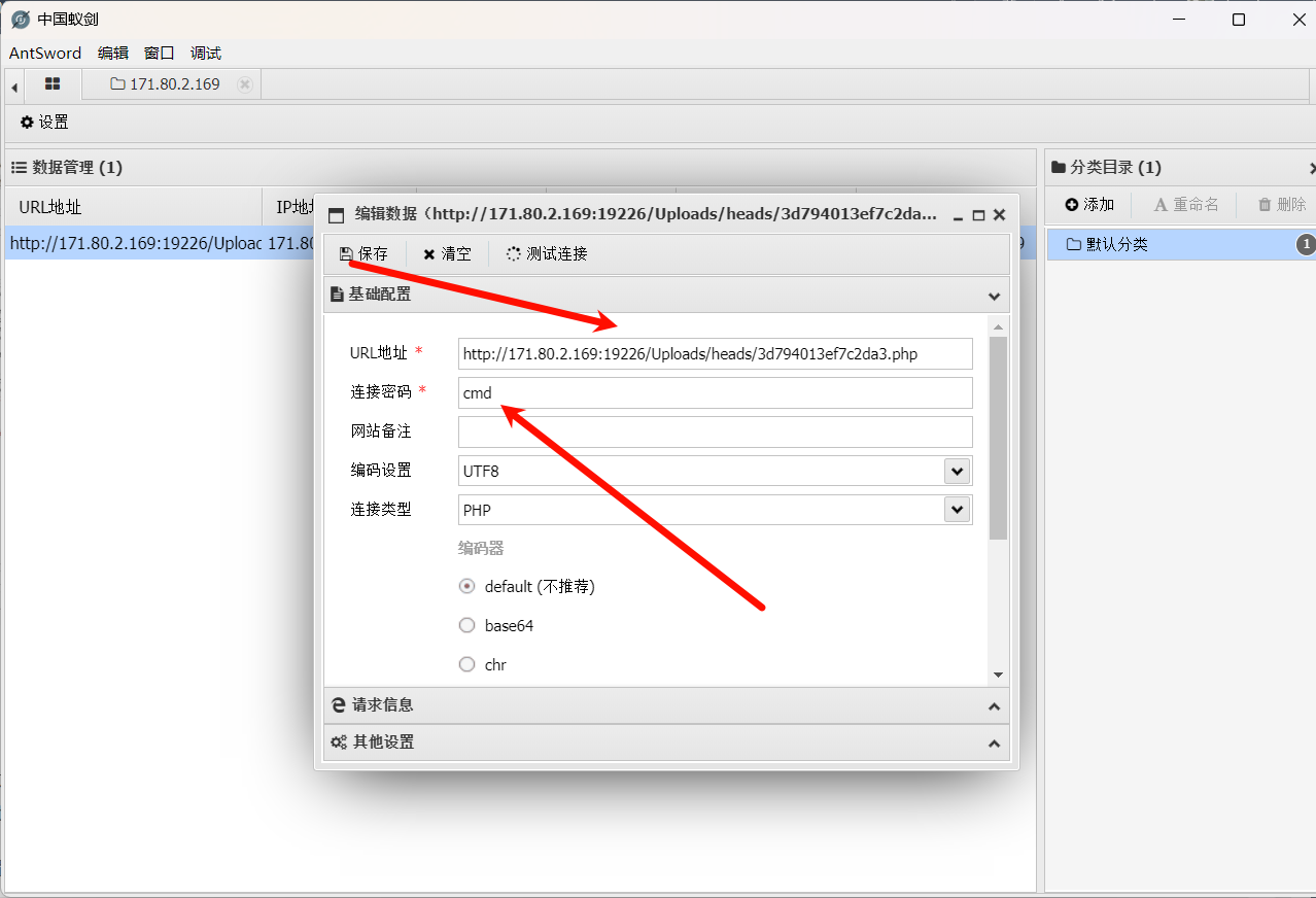 在bp的repeater模块中替换并发送了包之后,查看response(响应),可以从data中看到一个路径,使用它返回的路径,在蚁剑中进行连接。