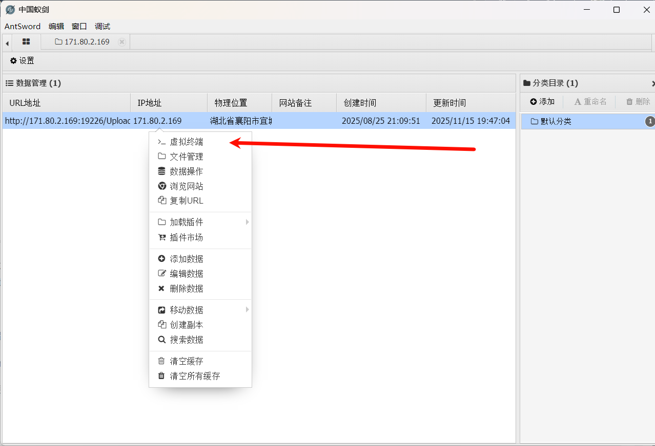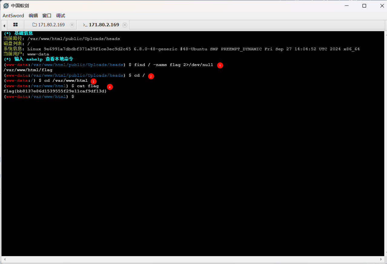 成功进入蚁剑之后,打开虚拟终端,输入“find / -name flag 2>/dev/null”即可找到flag的路径(/var/www/html/flag )