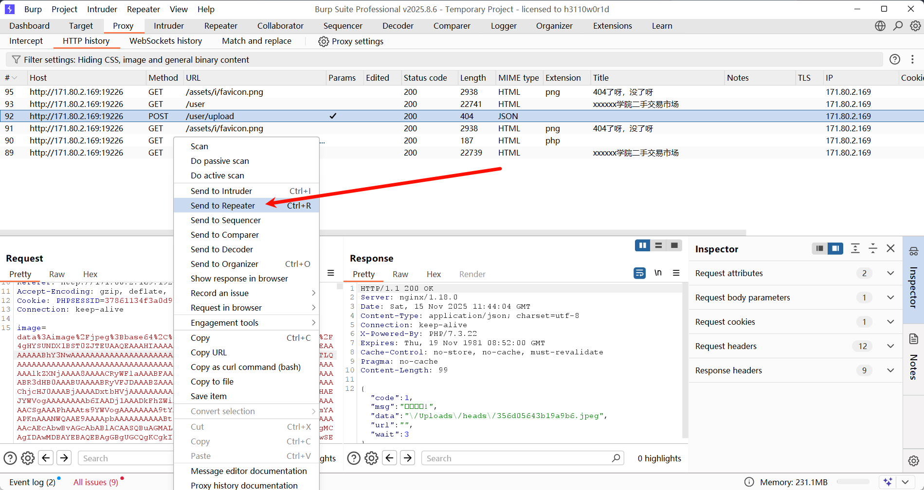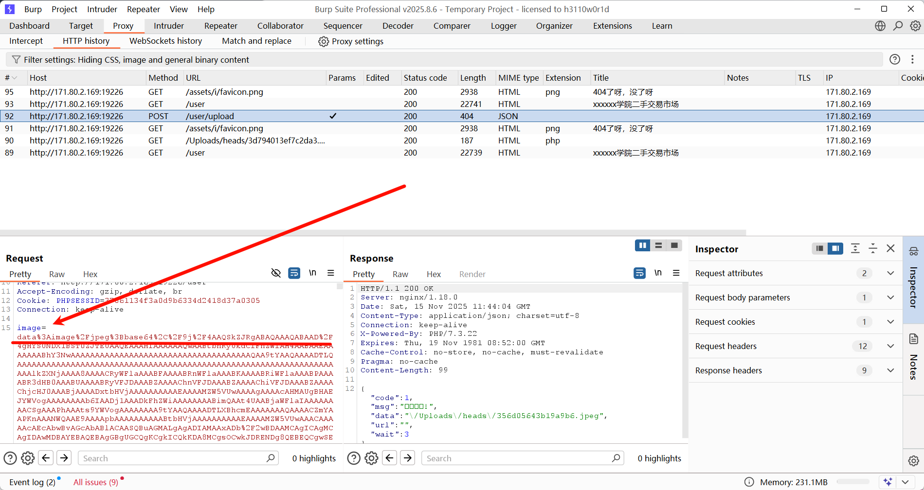 看了一下感觉有头像上传的漏洞点,打开bp,抓取上传头像的那个包