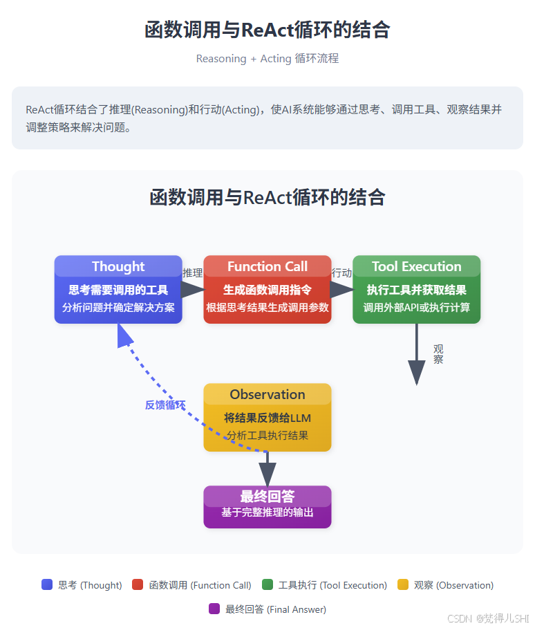 函数调用技术与 ReAct 范式的结合,形成了强大的 Agent 工作流: