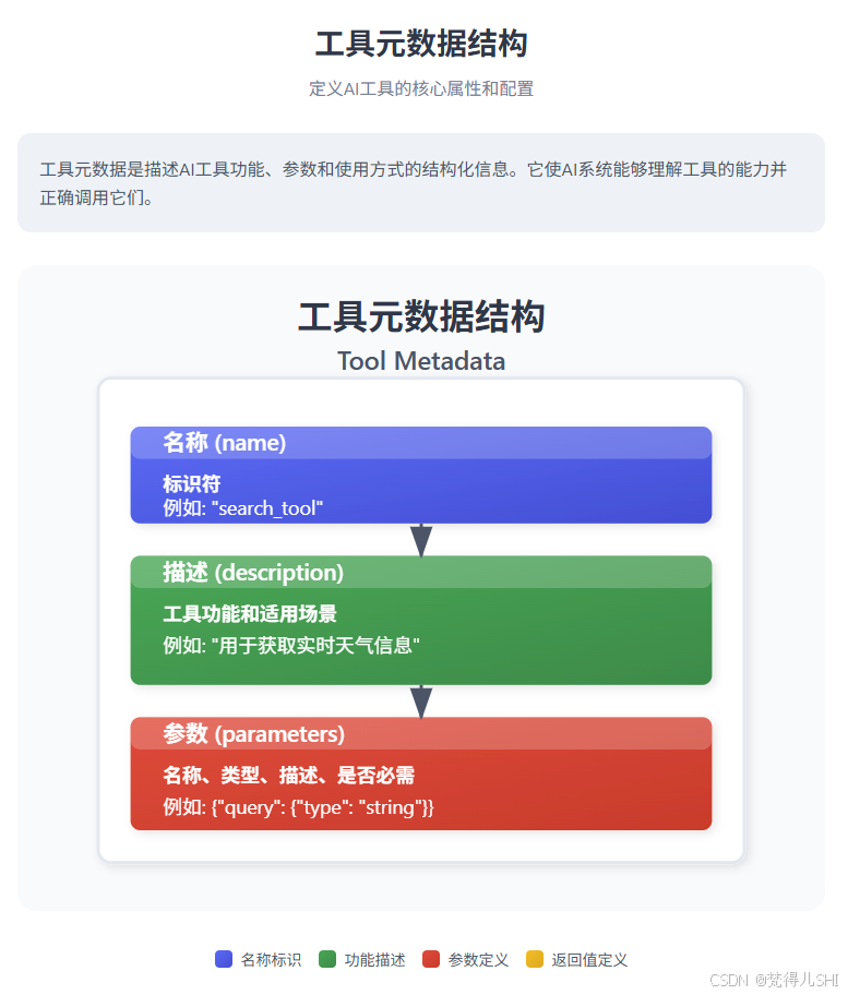 仅仅实现工具的功能还不够,我们还需要为每个工具提供详细的元数据(metadata),让 Agent 能够理解工具的用途、参数和使用场景。