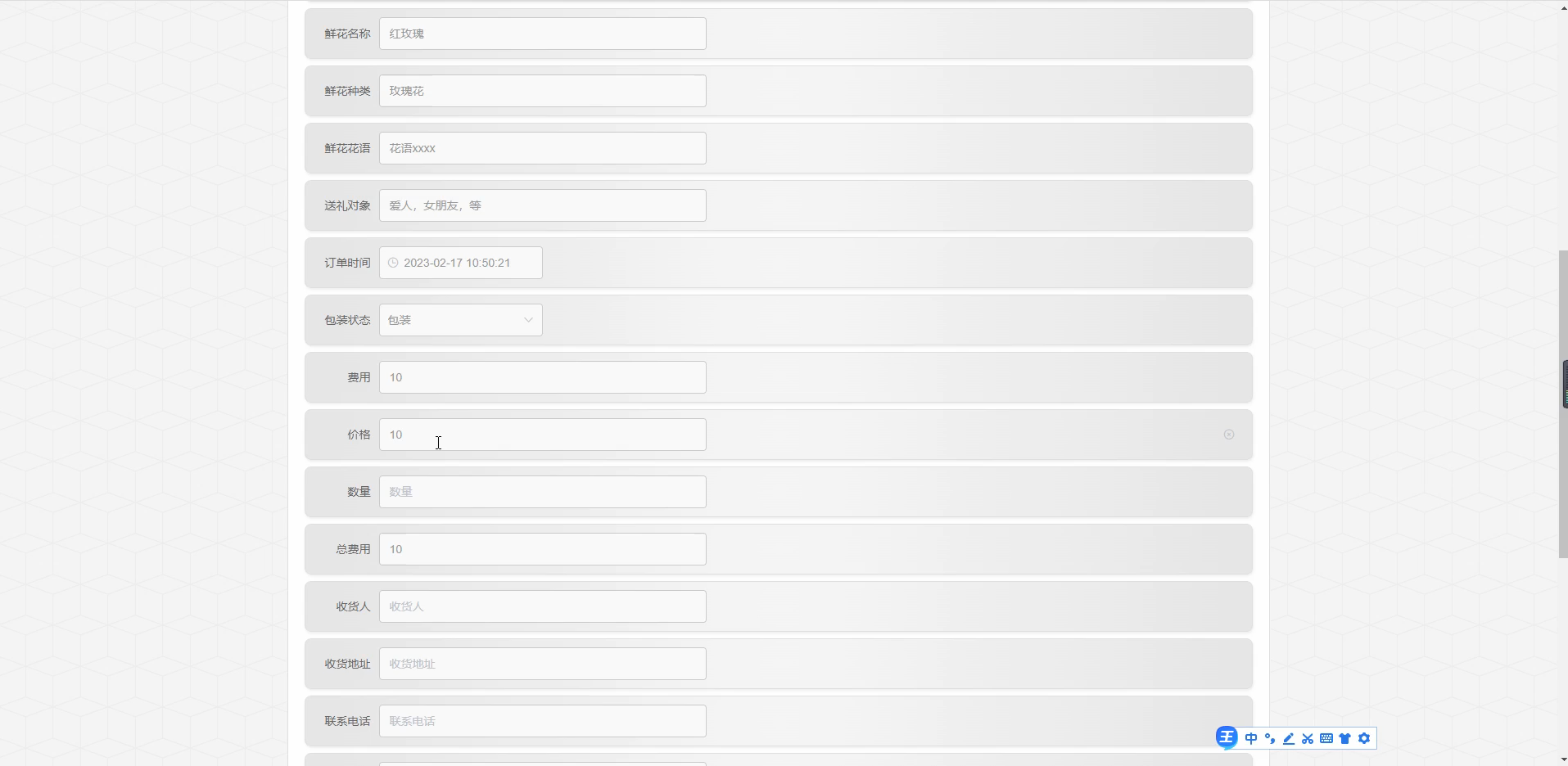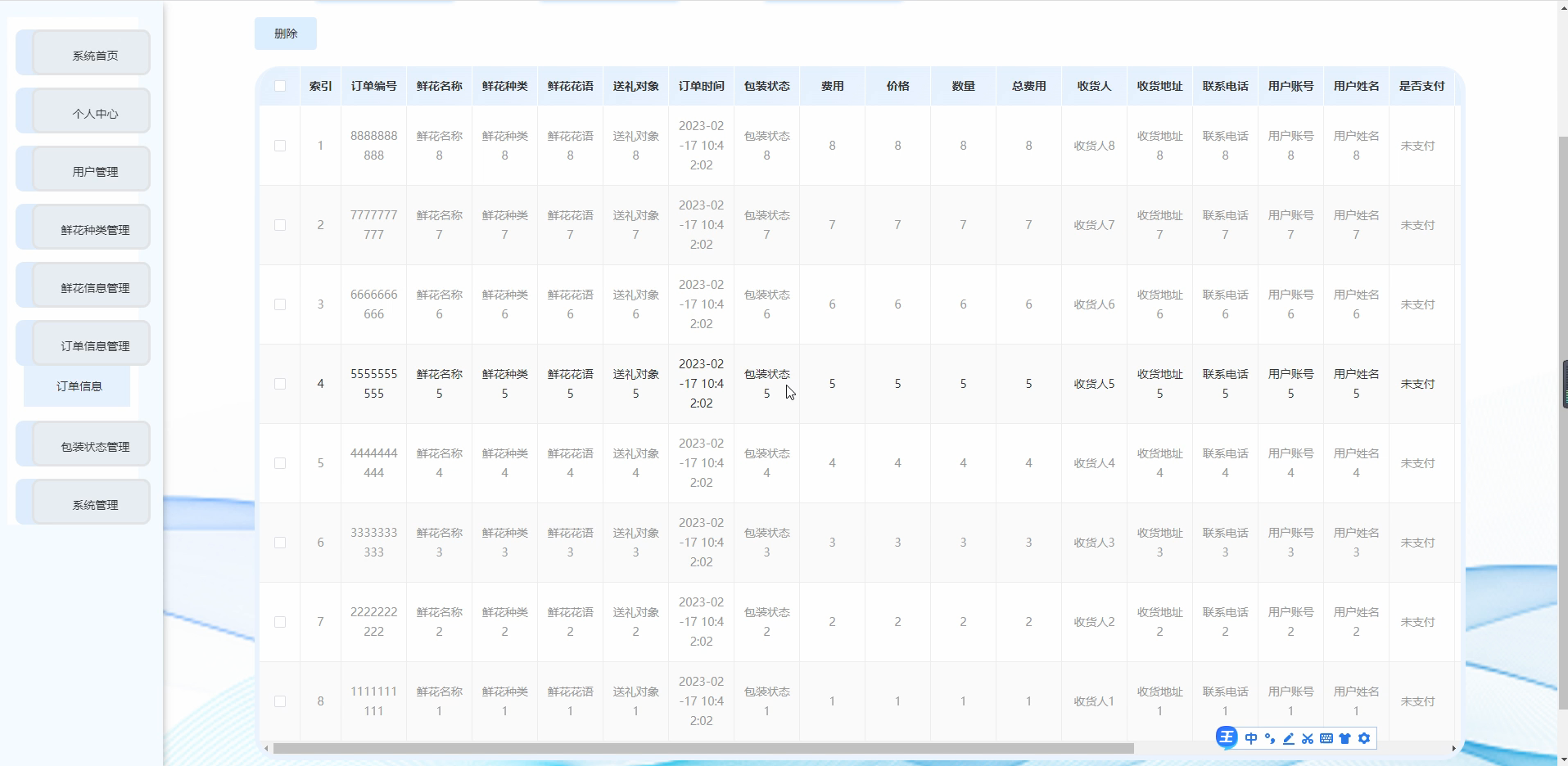 用户,鲜花种类,鲜花信息,订单信息,包装状态