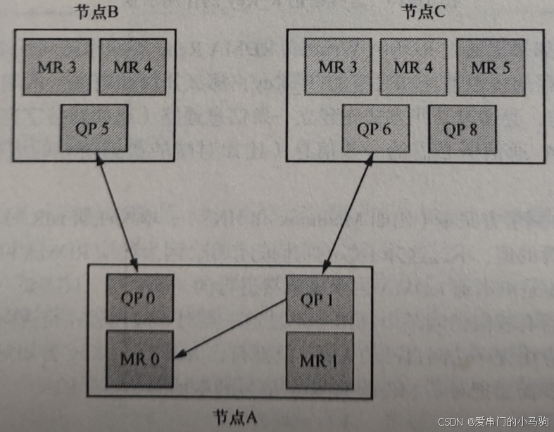 服务器 A 创建了两个 QP(QP0 和 QP1)和两个 MR(MR0 和 MR1)。设计目标是: