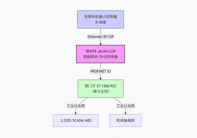 1.协议异构,信息断链:西门子的Profinet与发那科侧(虽使用以太网物理层,但上层协议为私有FOCAS或Ethernet/IP)无法直接对话。机床完成加工后,无法自动向机器人发送“上料完成、可执行焊接”的指令,反之,机器人也无法将焊接状态(如进行中、完成、故障)实时反馈给机床主控系统。