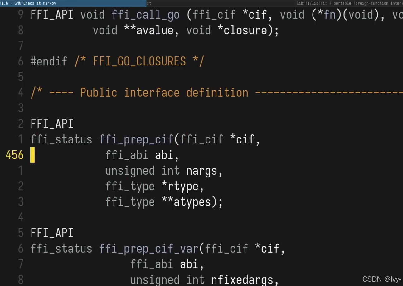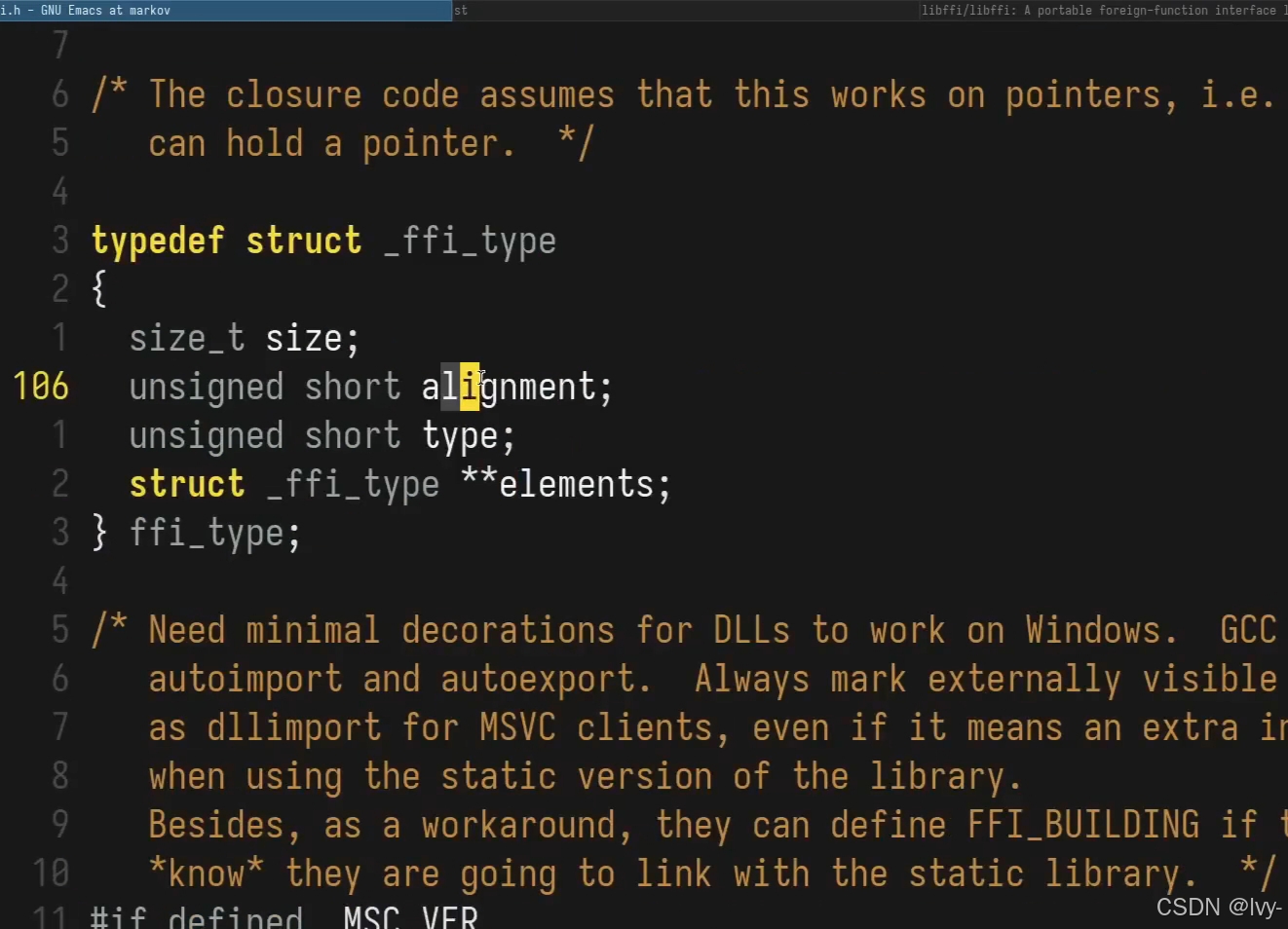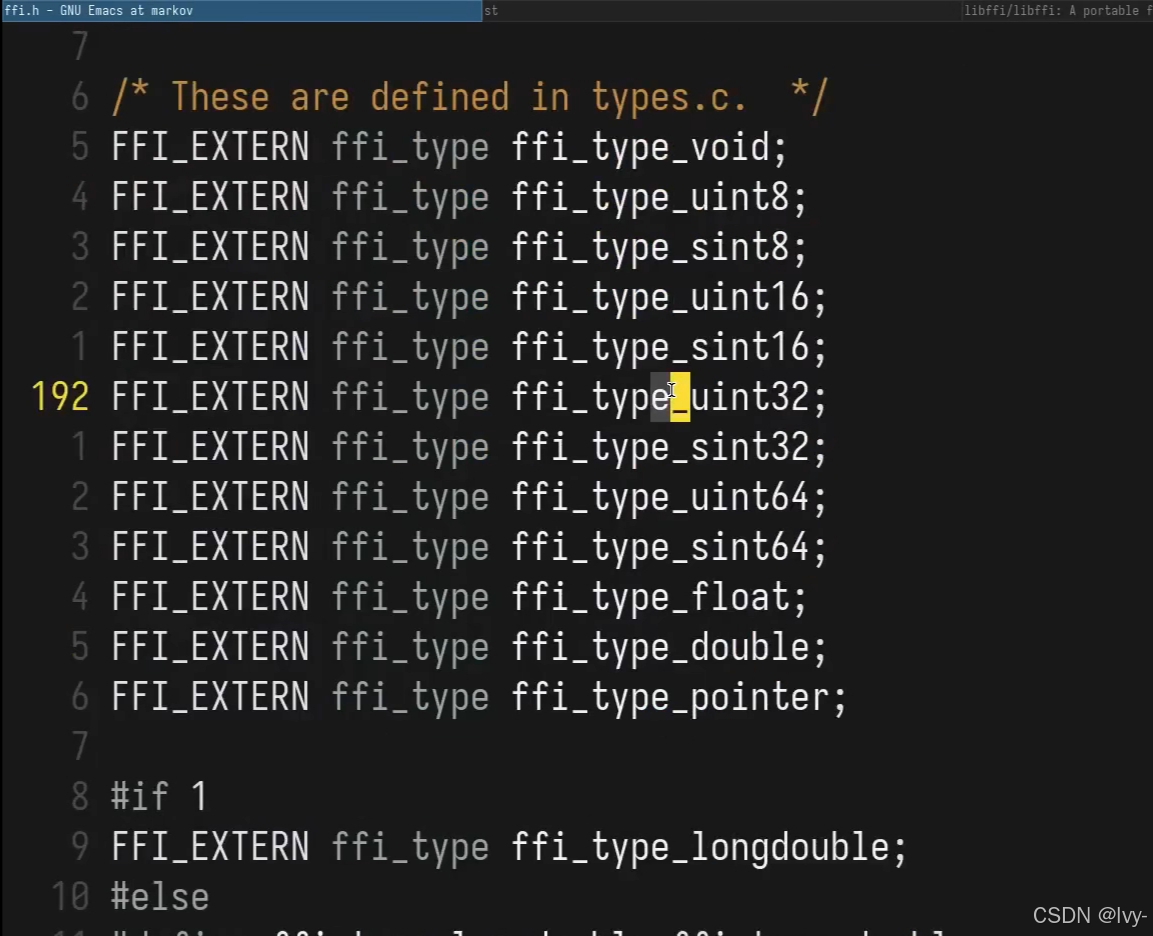 声明了ffi_type结构体,包含数据大小、对齐方式等元信息,用于描述函数参数/返回值的内存布局。
