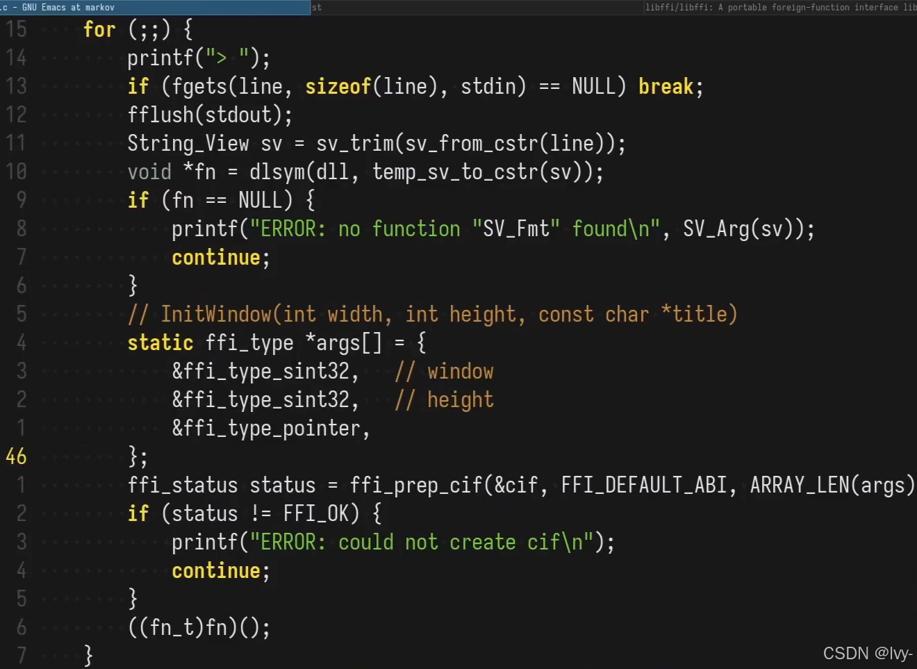 在代码里,它要调用像 InitWindow 这样的外部函数(来自图形库),所以需要ffi来明确参数类型(比如int、指针)、准备调用环境,最终让“自己的代码”能成功调用“别人的函数”。