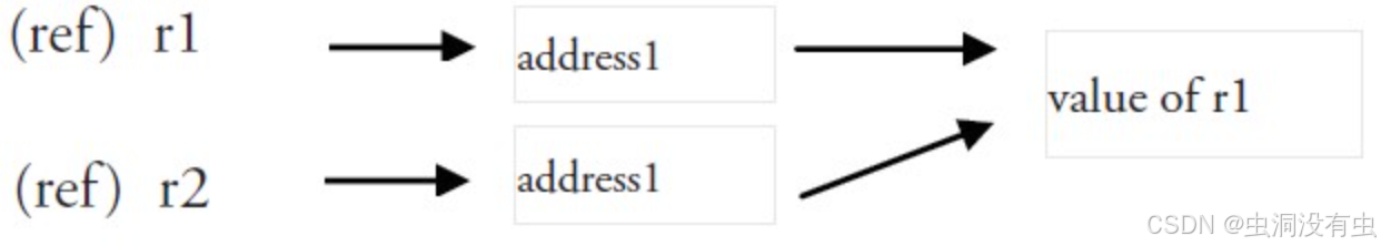 如果 r1 的值被改变了,那么这个值的所有引用都会指向被修改后的内容,在这个例子中,r2 也会受到影响。
