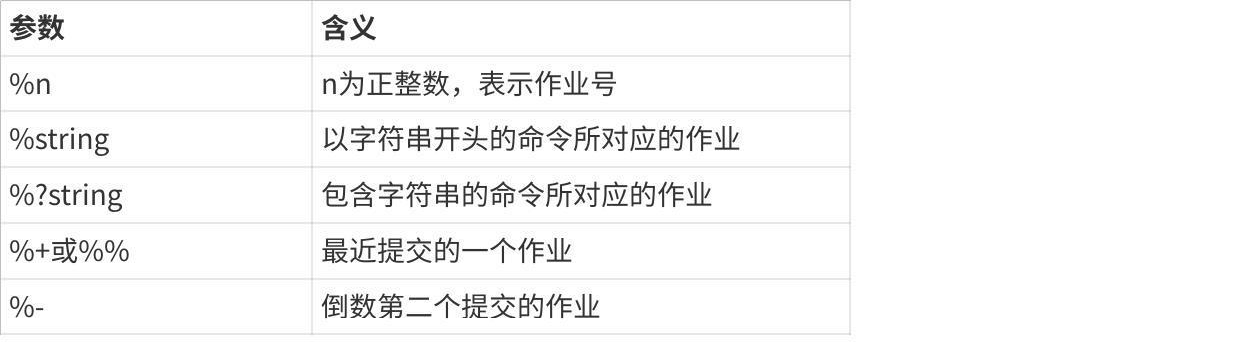 如果想将挂起的作业切回,可以通过 fg 命令,fg 后面可以跟作业号或作业的命令名称。如果参数缺省则会默认将作业号为 1 的作业切到前台来执⾏,若当前系统只有一个作业在后台进⾏,则可以直接使用 fg 命令不带参数直接切回。 具体的参数参考如下: