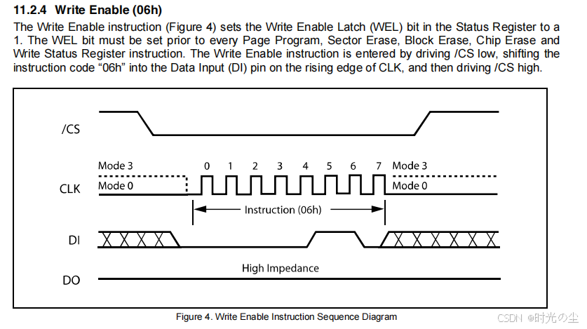 前置条件:在执行页编程、擦除(扇区/块/芯片)或写状态寄存器指令前,必须先执行此指令。