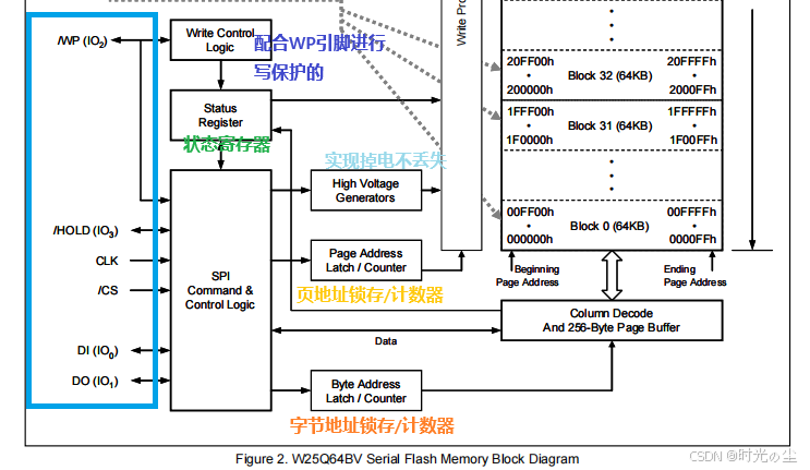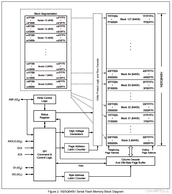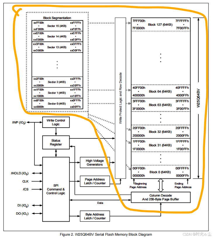 首先左侧框住部分和芯片引脚相连,可以参考上方电路图,然后 Write Control Logic 配合 WP 引脚进行写保护的操作,其状态会被状态寄存器记录下来: