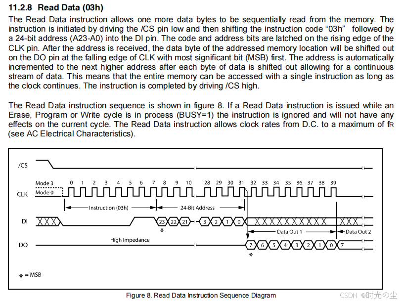 - 芯片从该地址开始,在 CLK 的下降沿通过 DO 引脚输出数据(MSB first)。