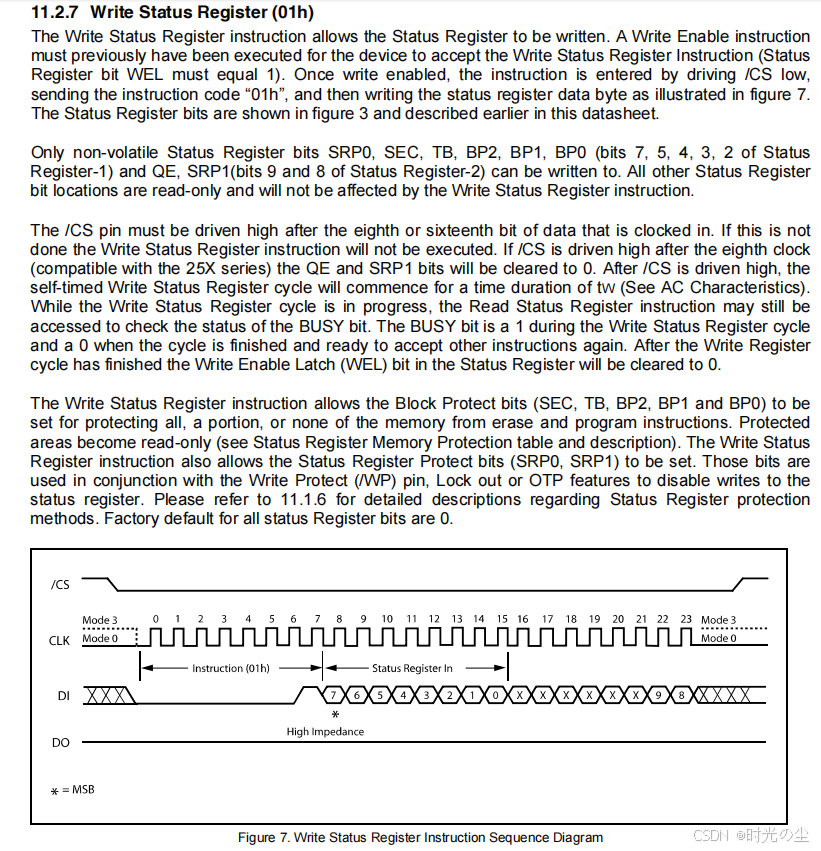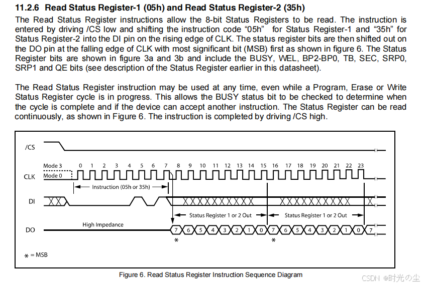 - 只要 /CS 保持为低,状态寄存器数据将持续输出。指令在 /CS 拉高后结束。