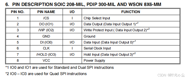 | CS(SS) | SPI片选,低电平有效 | 当 /CS 为高电平时,设备处于未选中状态,串行数据输出(DO 或 IO0、IO1、IO2、IO3)引脚处于高阻态。当设备未选中时,除非正在进行内部擦除、编程或状态寄存器操作,否则设备功耗将处于待机水平。 当 /CS 为低电平时,设备将被选中,功耗将增加到活动水平,并且可以向设备写入指令和从设备读取数据。 上电后,在接受新指令之前,/CS 必须从高电平变为低电平。/CS 输入在上电时必须跟踪 VCC 电源电平,如有需要,可在 /CS 上使用上拉电阻来实现这一点。 |