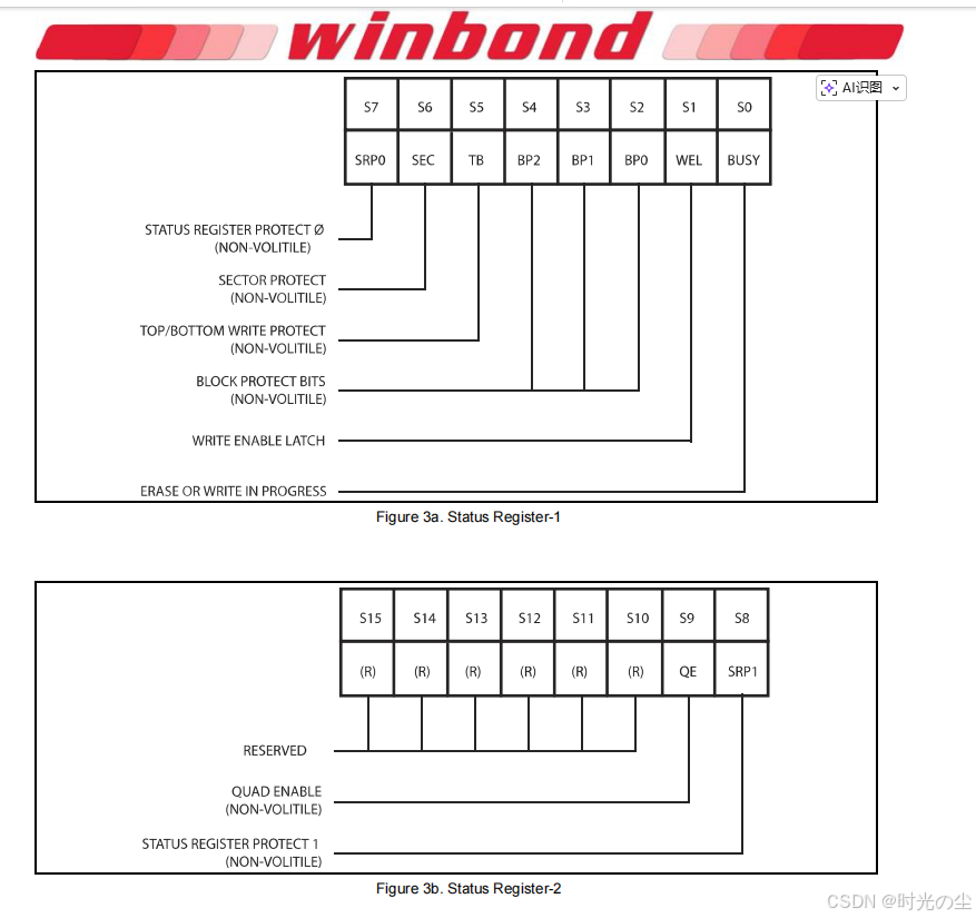 - BUSY位:忙位,是只读位,位于状态寄存器中的S0。当执行页编程、扇区擦除、块擦除、芯片擦除、写状态寄存器等指令时,该位将自动置 1。此时,除了读状态寄存器指令,其他指令都忽略;当页编程、扇区擦除、块擦除、芯片擦除和写状态寄存器等指令执行完毕之后,该位将自动清 0,表示芯片可以接收其他指令了。
