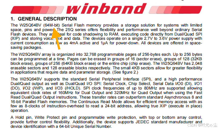 对于上述数据怎么来的呢?我们可以参考数据手册,对于W25Q64其是 64Mbit 的容量,而1数据位是8字节,那么 64Mbit 就是 8MByte: