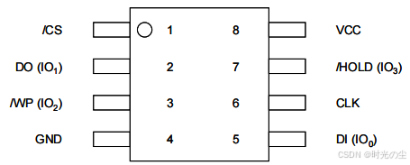 | HOLD | 数据保持 | /HOLD 引脚允许在设备被选中时将其暂停。当 /HOLD 被拉低时。当 /CS 为低电平时,DO 引脚将处于高阻态,DI 和 CLK 引脚上的信号将被忽略(无关紧要)。当 /HOLD 被置为高电平时,设备操作可以恢复。当多个设备共享相同的 SPI 信号时,HOLD 功能可能很有用。/HOLD 引脚为低电平有效。当状态寄存器 2 的 QE 位设置为四线 I/O 时,HOLD 引脚功能不可用,因为此引脚用于 IO3。 |