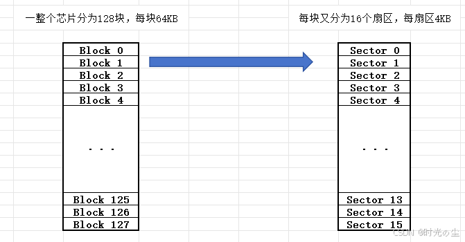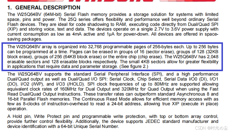 简单翻译一下,W25Q64BV 阵列由 32,768 个可编程页组成,每页 256 字节。每次最多可编程 256 字节。页可以以 16 页为一组(扇区擦除)、128 页为一组(32KB 块擦除)、256 页为一组(64KB 块擦除)或整个芯片(芯片擦除)的方式进行擦除。W25Q64BV 分别具有 2048 个可擦除扇区和 128 个可擦除块。较小的 4KB 扇区在需要数据和参数存储的应用中提供了更大的灵活性: