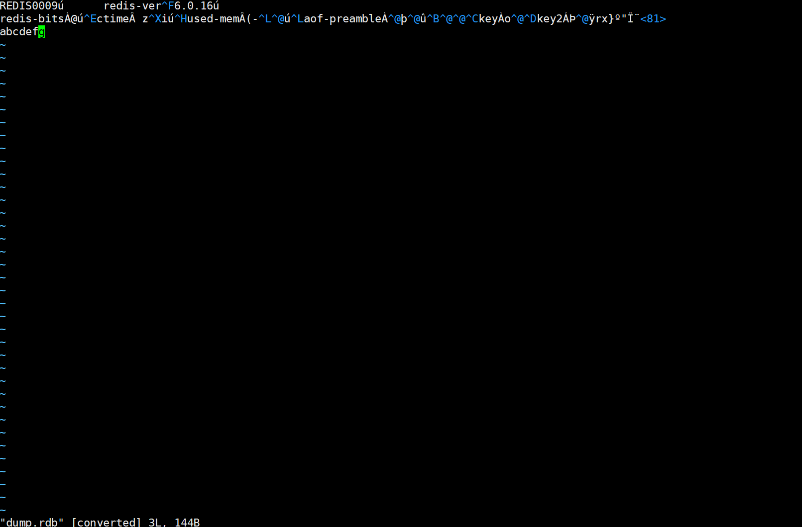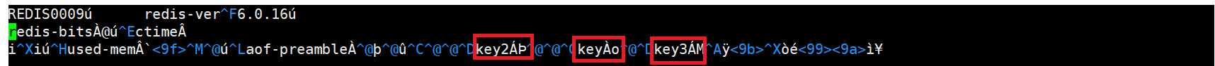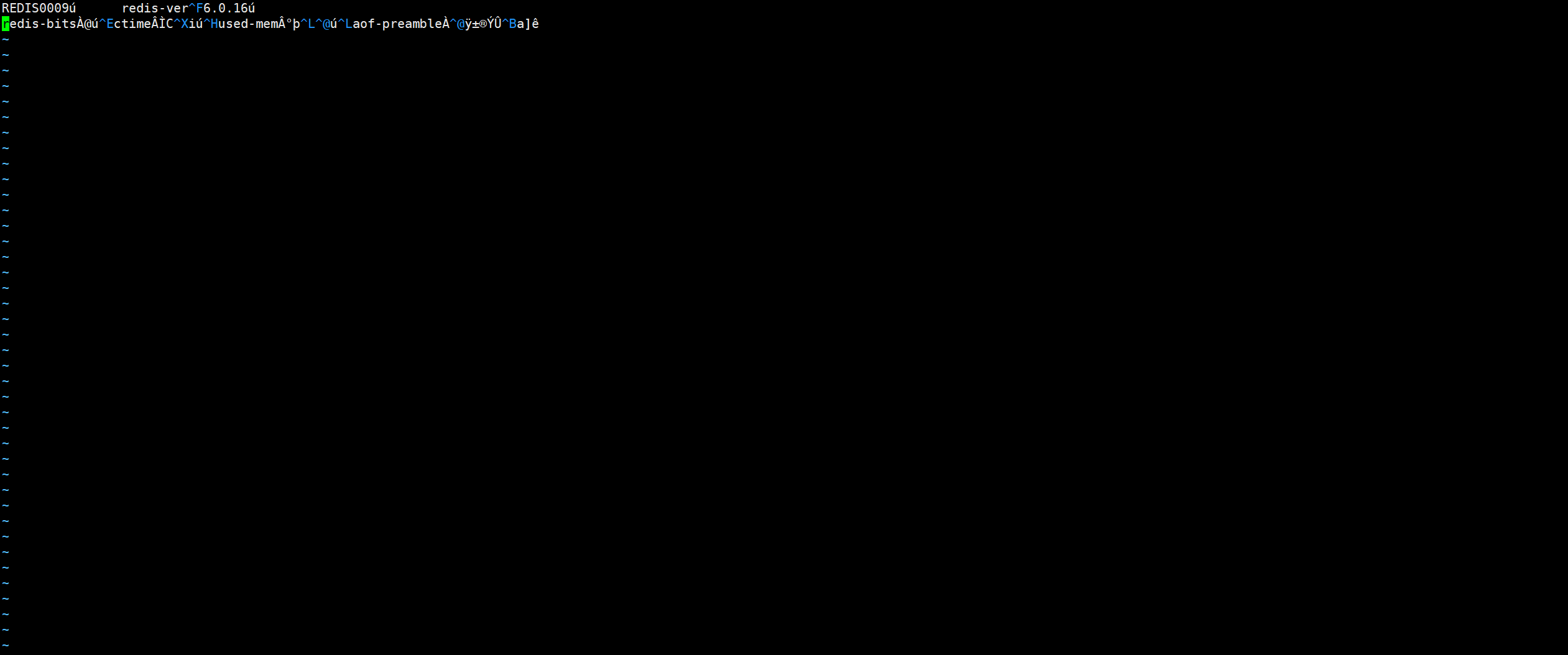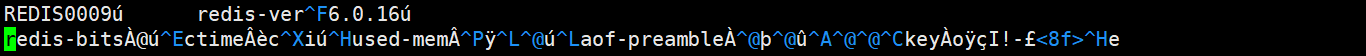 我们vim进入这个rgb文件看看,注意:这里只能是看看,一旦把这个文件数据格式改坏了就麻烦了~~后续redis重启,就会尝试加载这个rgb文件(这个rgb文件,虽然咱们不主动去动它,但是也可能出现一些意外问题,一旦通过一些操作(比如一些网络传输)引起这个文件被破坏,此时redis服务器就无法启动),如果发现格式错误,就可能会加载数据失败~~