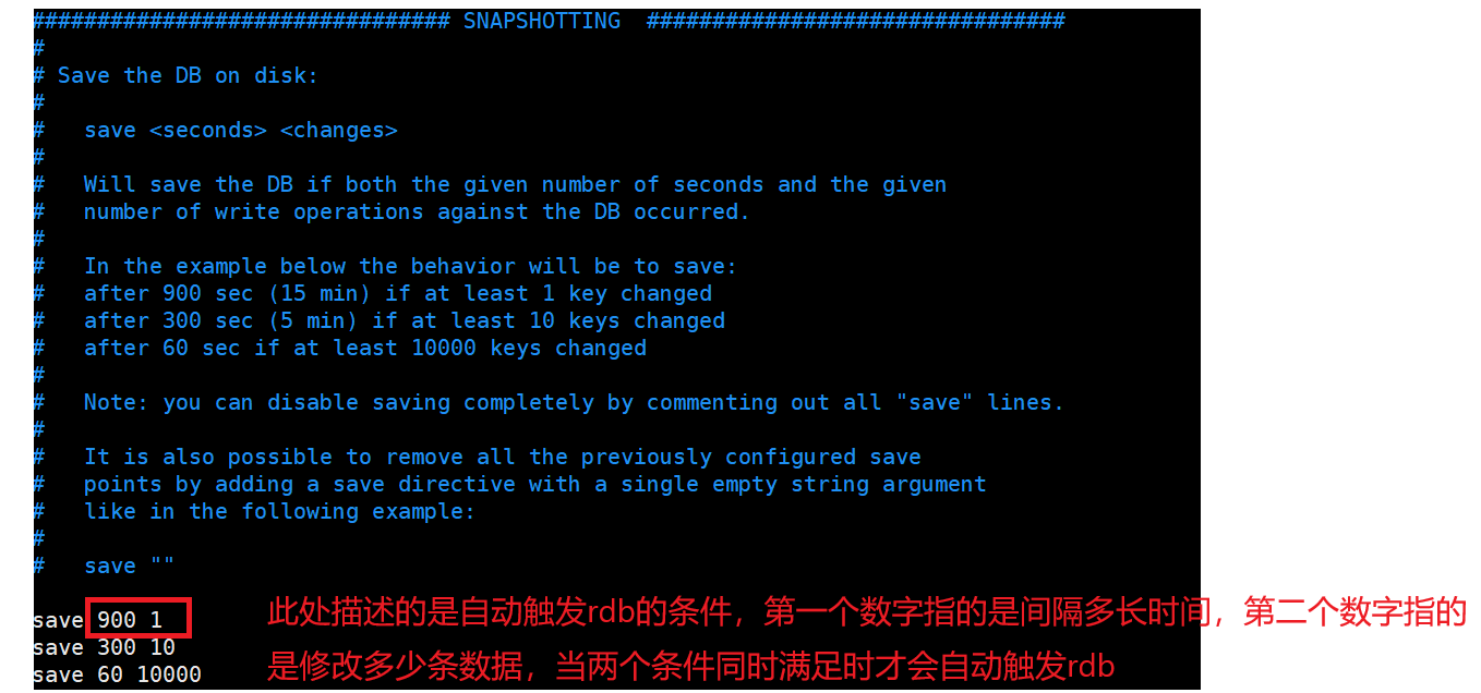 刚才我们也讲了rdb的触发时机可以分为手动(save,bgsave)和自动(配置文件中,进入设置)。