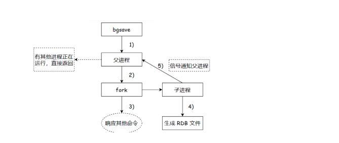 3、父进程fork完成后,bgsave命令返回“Background saving started”信息并不再阻塞父进程以继续响应其他命令