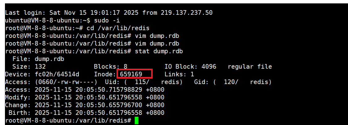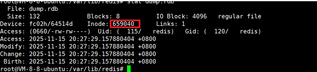 此处文件内容和大小虽然是一样的,但是因为执行了bgsave,文件已经不是同一个文件了(inode编号,就相当于文件的身份标识)。
