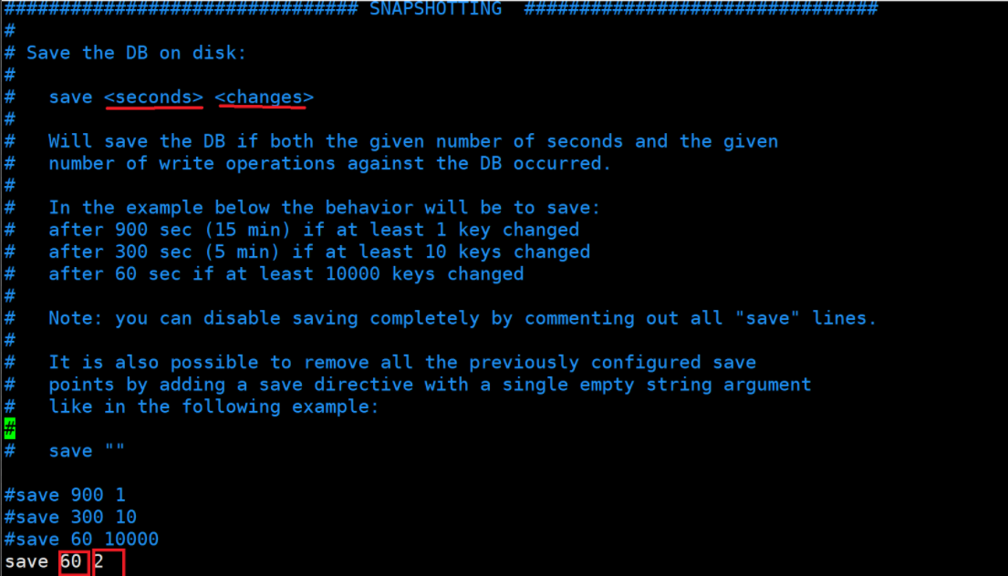 这里我们修改为当更新两条数据之后就会自动生成rdb快照: