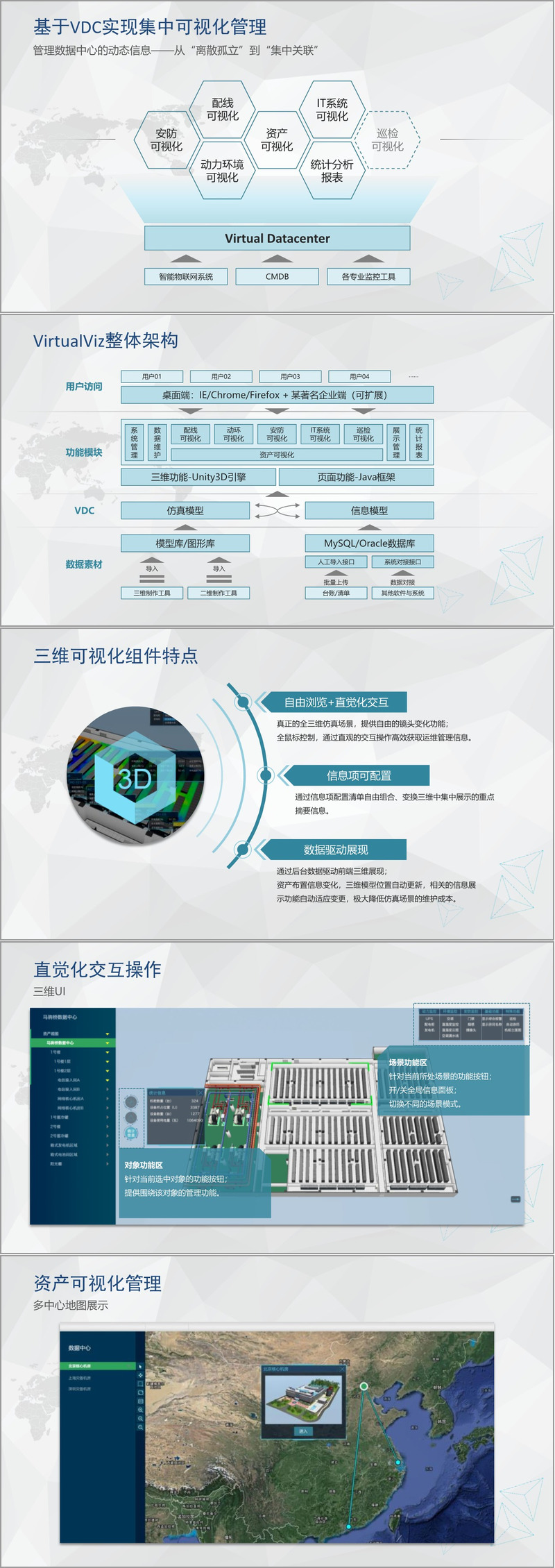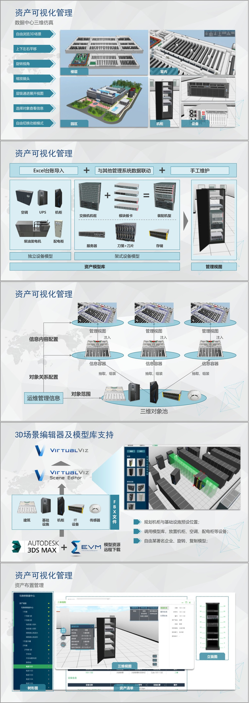 核心产品 EVM 企业可视化管理平台,包含 VirtualViz 仿真可视化系统等核心组件,以资产管理为核心,整合动环、安防、IT 系统等多维度数据。其通过搭建虚拟数据中心,将建筑空间、基础设施、机柜设备等转化为统一的 3D 仿真模型,同时融入资产 ID、维保期限、拓扑关系等信息,实现从 “异构抽象” 到 “统一可视” 的转变。平台支持自由浏览、直觉化交互,用户可通过平移、旋转、缩放等操作,层级递进查看园区、楼层、机房、机柜乃至设备的详细状态。