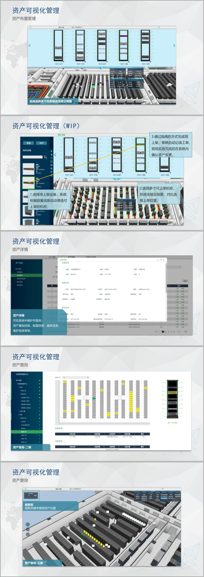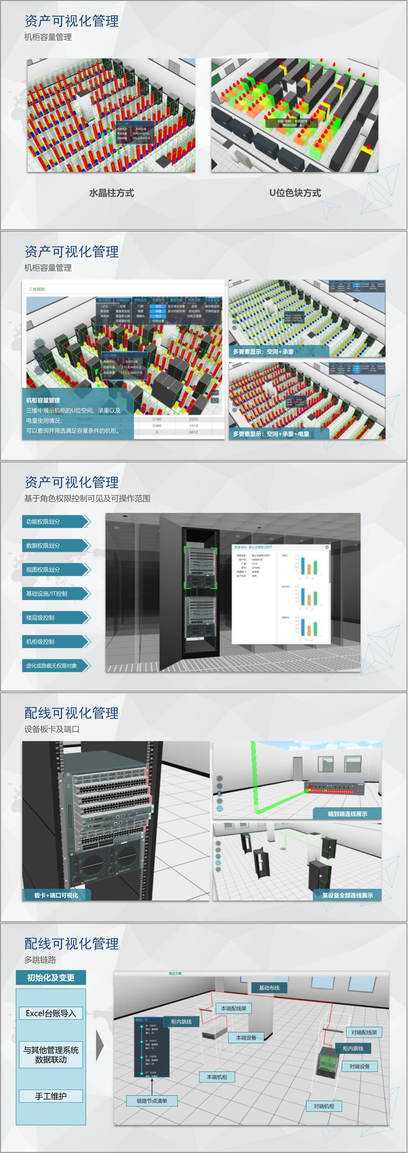 在功能模块上,解决方案实现了全场景覆盖。资产可视化管理支持多中心地图展示与三维仿真,可通过 Excel 台账导入、系统联动等方式维护资产信息,还能实现机柜容量的多要素监控与预上架模拟。配线可视化清晰呈现设备板卡、端口及端到端连线,支持多跳链路追溯。动力环境可视化集中展示 UPS、空调、传感器等设备运行数据,通过温湿度云图与机柜微环境监控,实现环境状态实时感知。安防可视化与 IT 系统可视化则分别聚焦烟感报警、视频监控与设备运行、拓扑联动,形成全方位监控网络。