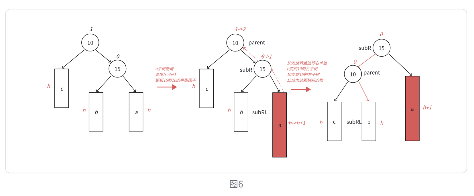 • 本图6展示的是10为根的树,有a/b/c抽象为三棵高度为h的子树(h>=0),a/b/c均符合AVL树的要求。10可能是整棵树的根,也可能是一棵整棵树中局部的子树的根。这里a/b/c是高度为h的子树,是一种概括抽象表示,它代表了所有左单旋的场景,实际左单旋形态有很多种,具体跟上面右单旋类似。