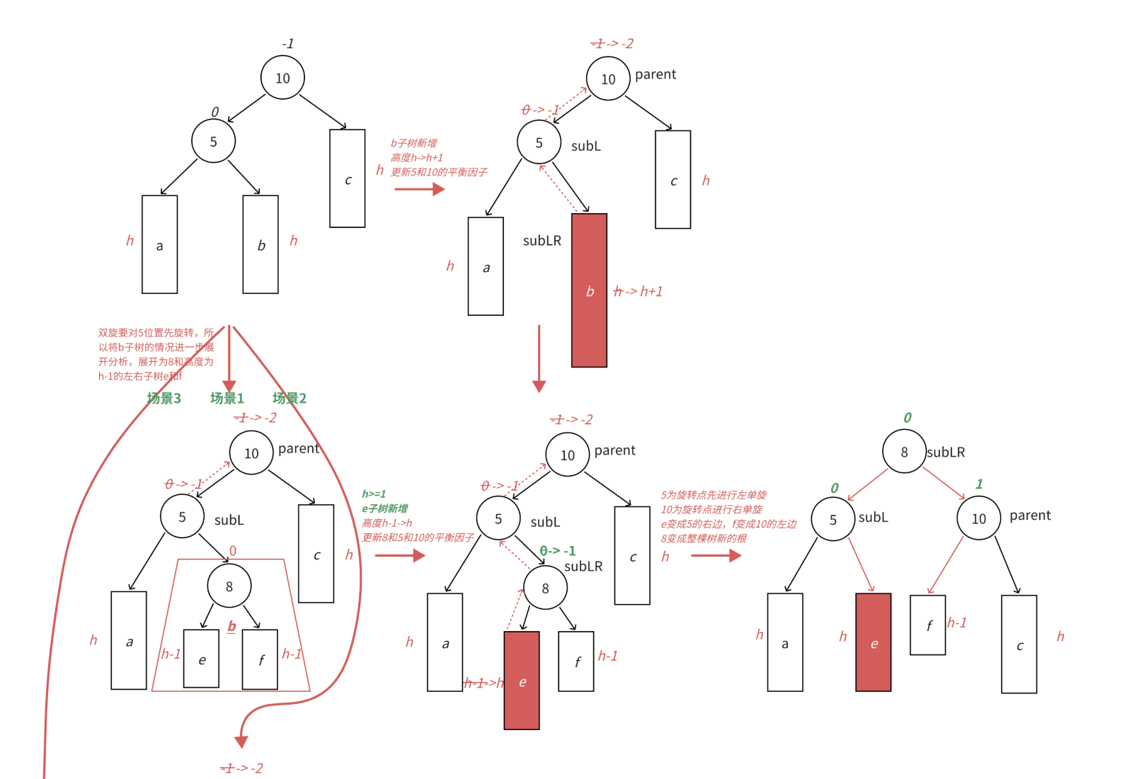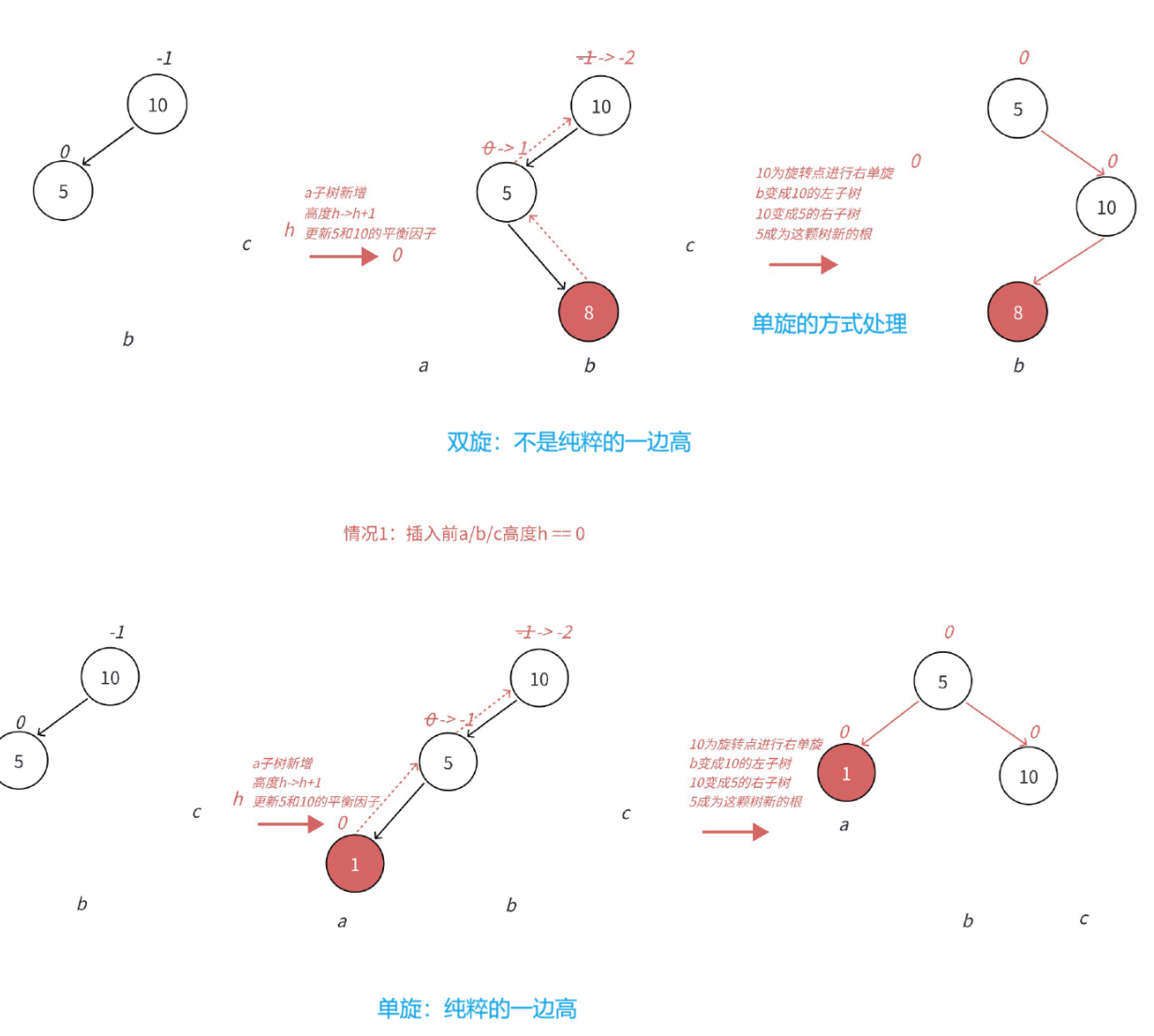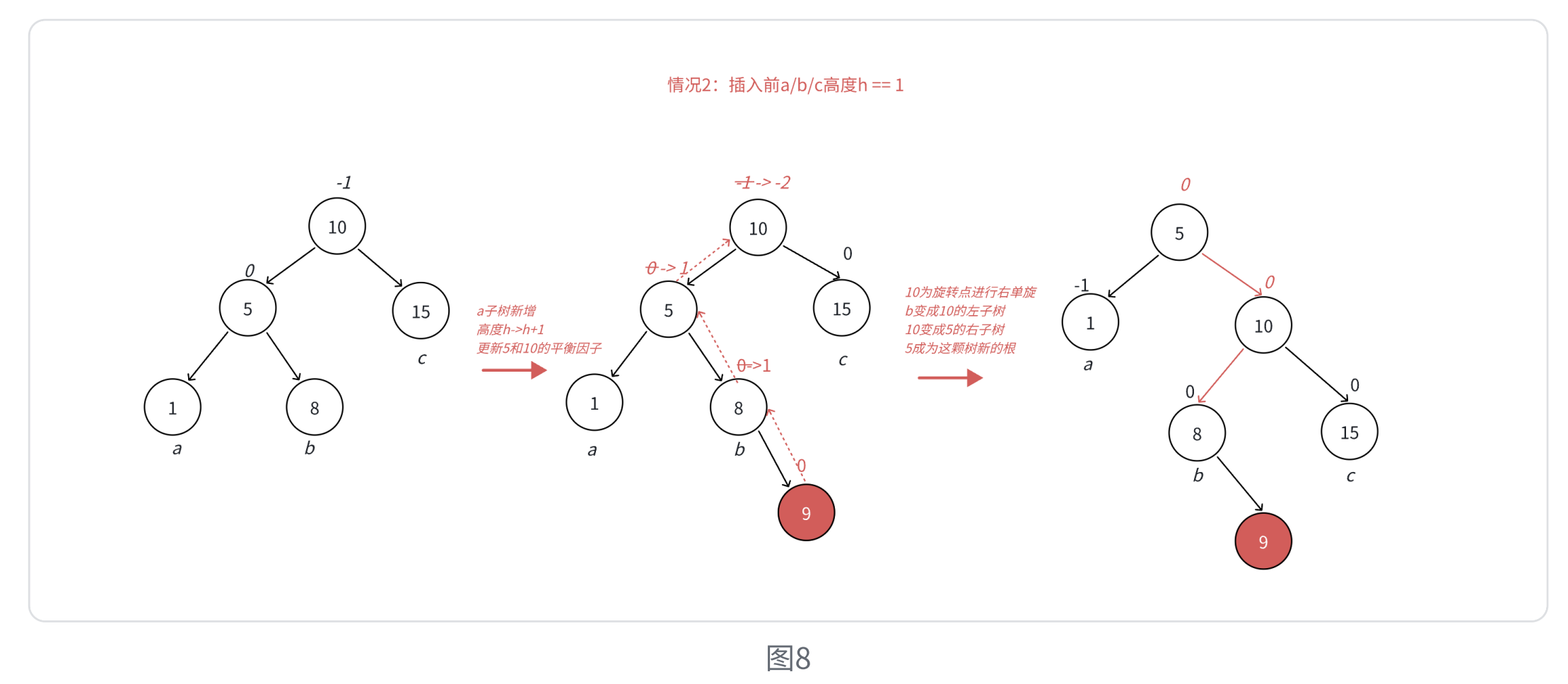 • 场景3:h == 0时,a/b/c均为空树,b本身就是新增结点,不断更新5→10的平衡因子,最终引发旋转。其中8的平衡因子为0,旋转后8、10和5的平衡因子均变为0。