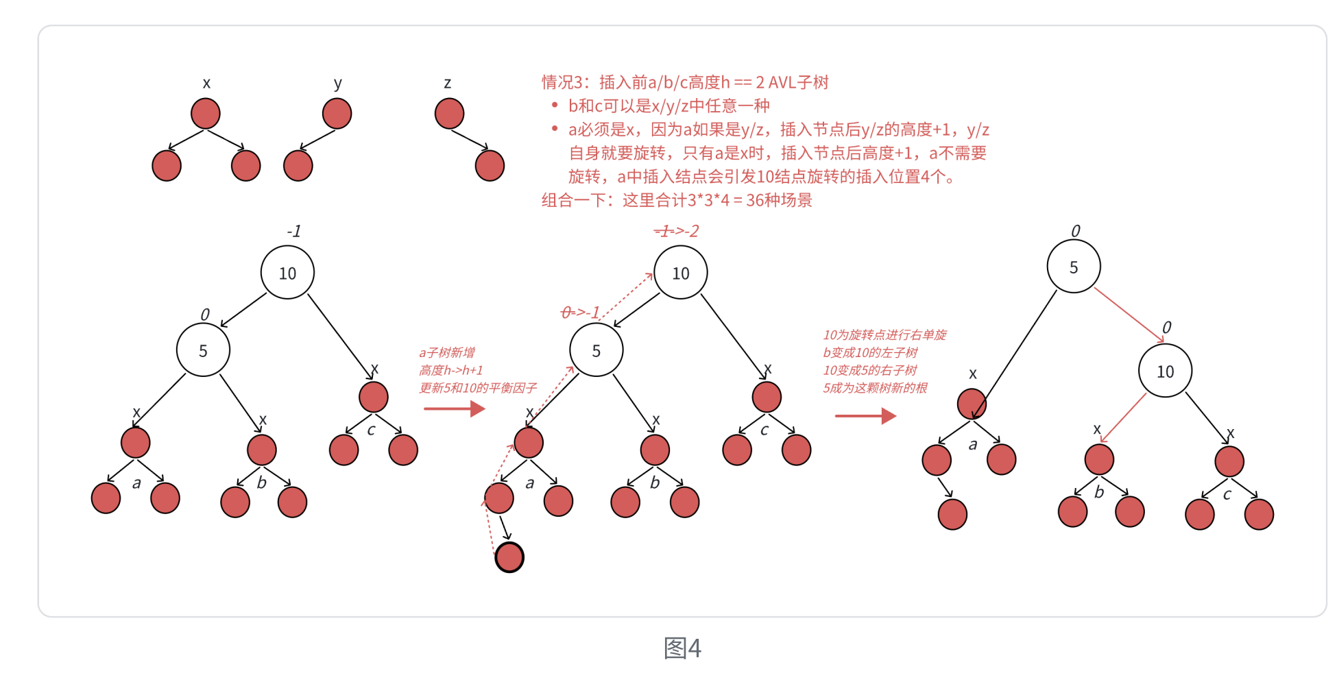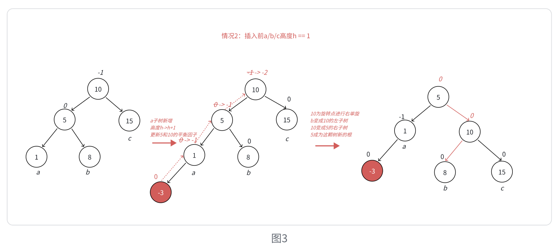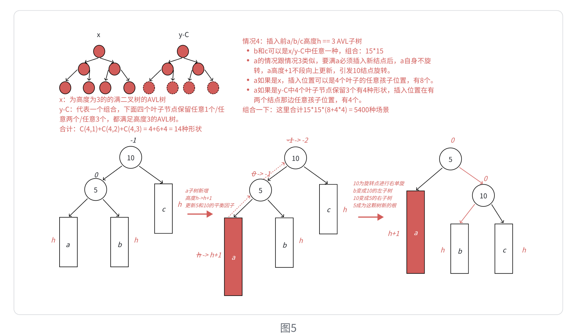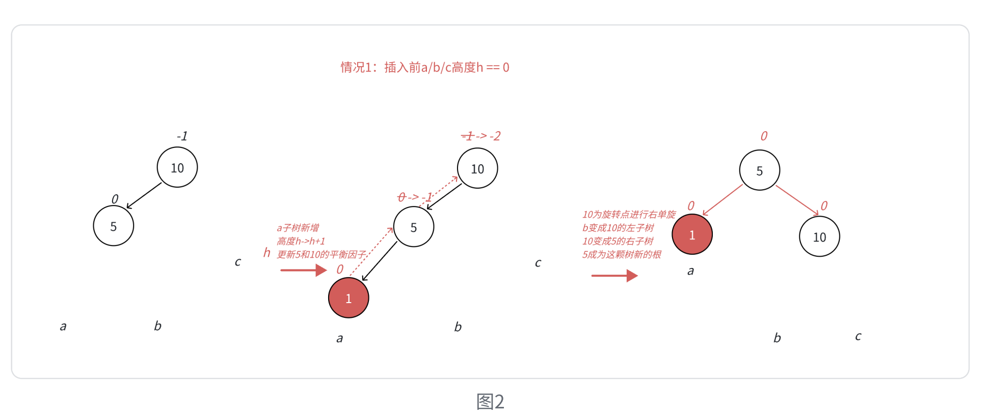 • 场景3:h == 0时,a/b/c均为空树,b本身就是新增结点,不断更新5→10的平衡因子,最终引发旋转。其中8的平衡因子为0,旋转后8、10和5的平衡因子均变为0。