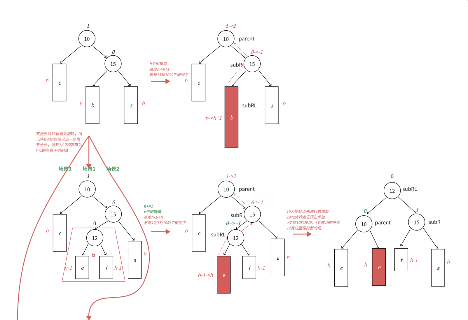 • 场景1:h >= 1时,新增结点插入在e子树,e子树高度从h-1变为h并不断更新12->15->10平衡因子,引发旋转,其中12的平衡因子为-1,旋转后10和12平衡因子为0,15平衡因子为1。