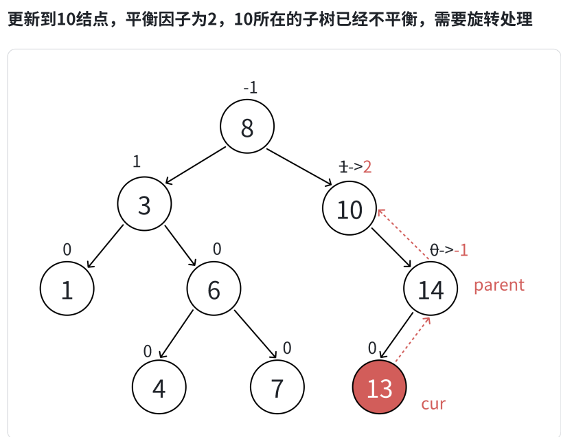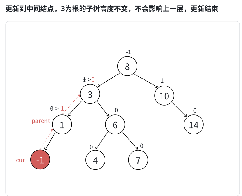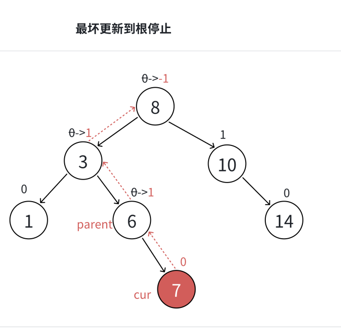 • parent所在子树的高度是否变化,决定了是否需要继续往上更新平衡因子。